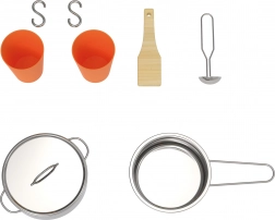 A csomag tartalma: fedeles fazekak, 2 pohár, spatula, kanál, függő akasztók, krétatábla és alap konyhai felszerelés (mosogató, főzőlapok, polcok). Tökéletes választás kültéri és beltéri kis szakácssarkokhoz.