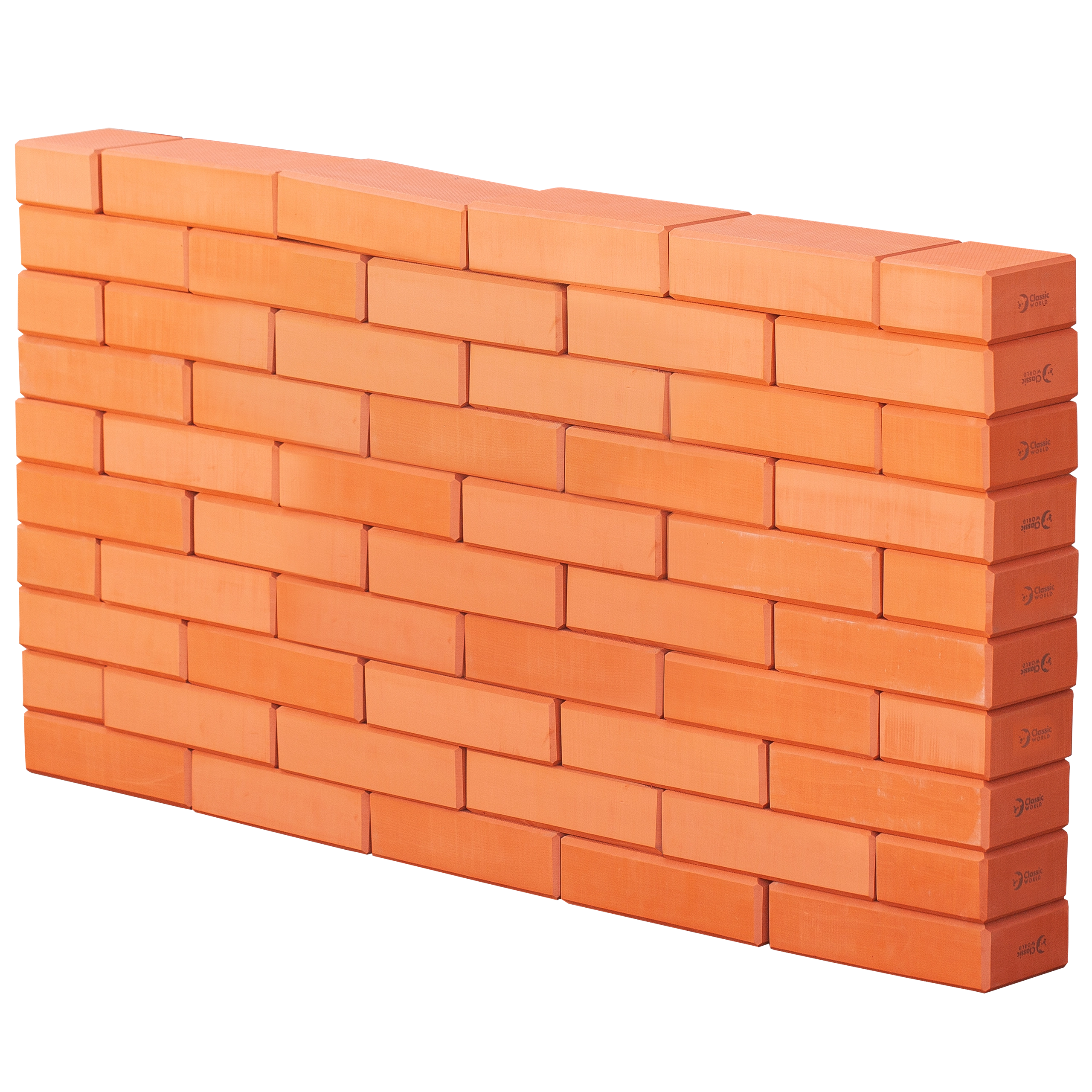 A 90 darabos készlet 70 egész téglát és 20 fél téglát tartalmaz narancs–piros árnyalatban. A puha EVA anyagnak köszönhetően a blokkok könnyűek, kellemes tapintásúak és kíméletesek a gyerekek kezéhez, ugyanakkor elég szilárdak falak, házikók és erődök építéséhez. A gyerekek közösen tervezhetnek és építhetnek, ezzel fejlesztve az együttműködést és a kommunikációs készségeket.