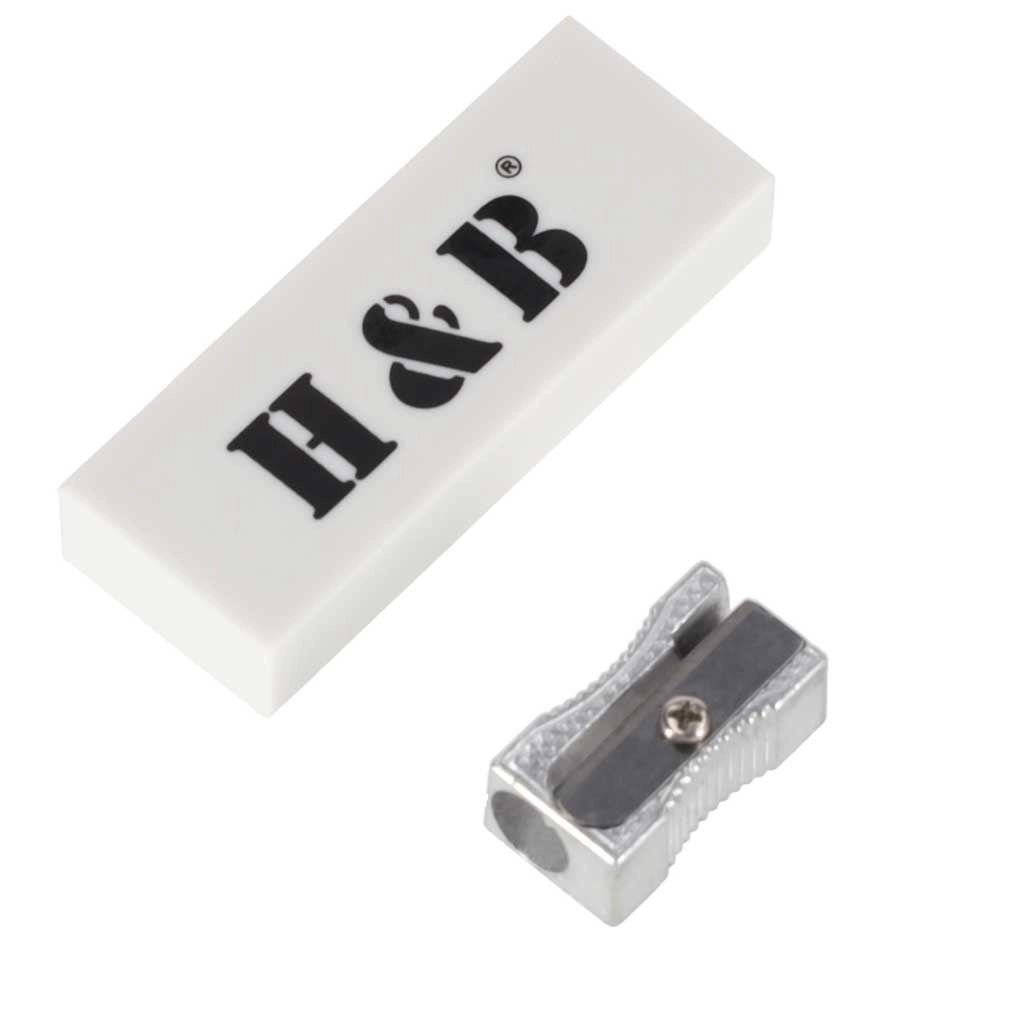 A készlet része egy minőségi radír és egy fém hegyező, így bárhol és bármikor rajzolhat, javíthat és hegyezhet.