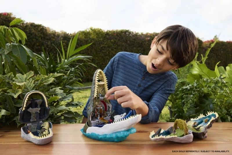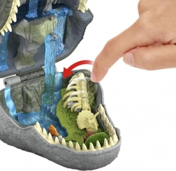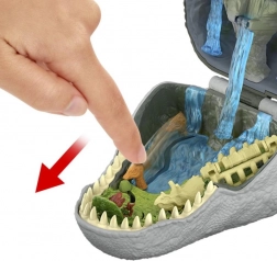Fedezze fel az apró, mégis izgalmas kalandot a dinoszauruszfej alakú hordozható játékkészlettel! A készlet akciódússá nyílik, benne négy filmes környezettel, három mikrofigurával és ujjal irányítható interaktív elemekkel a végtelen szórakozásért. Összecsukott állapotban a hátulsó karral aktiválható a harapás effektus. Otthonra és útra is ideális – könnyen összecsukható és elfér a hátizsákban.