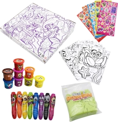 A készlet részei a vidám arcokkal díszített jumbo filctollak a kényelmes fogásért, a nem mérgező, illatos gyurma élénk színekben, tégelyekben a könnyű tároláshoz, valamint az illatos kinetikus homok, amely remekül formázható és nem morzsálódik. Az állatos motívumú színezők bővítik az alkotási lehetőségeket, és hosszú időre lekötik a gyerekeket otthon és utazás közben is.