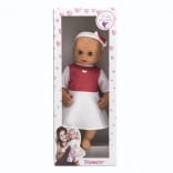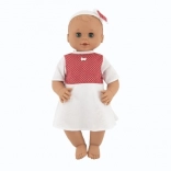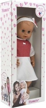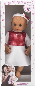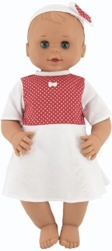 A baba tökéletes kisgyermekek számára már születéstől kezdve, biztonságos kialakításának köszönhetően. Fehér ruhácskát visel piros pöttyökkel, ami aranyos megjelenést kölcsönöz neki. A mozgatható szemek autentikussá és interaktívvá teszik.