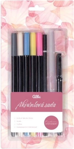 Teljes akvarell készlet kreatív alkotáshoz, benne 5 színű dupla végű ecsetfilccel, radírral, grafitceruzával és permanent markerrel – mindennel, amire a vázlatoláshoz, kontúrozáshoz és színes akvarell hatásokhoz szükség van.
