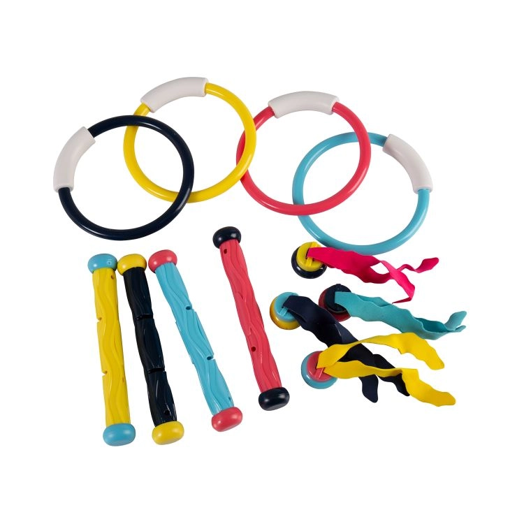 A különböző formáknak és színeknek köszönhetően a gyerekek fejleszthetik merülési készségüket, koordinációjukat és légzésállóképességüket. A számozott pálcák pontszerző játékokhoz ideálisak, míg a gyűrűk és a „tengeri hínár” a víz alatti elkapást és tájékozódást segítik.