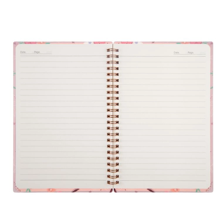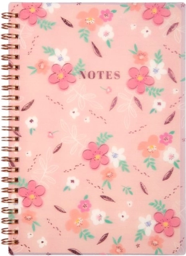 Elegáns, rózsaszín jegyzetfüzet virágmintával A5 méretben, ideális iskolába, munkába és személyes jegyzetekhez. A fém spirálnak köszönhetően könnyű a lapozás, a vonalazott lapok áttekinthetővé teszik az írást, a jobb felső sarokban pedig praktikus hely van a dátumnak és az oldalszámnak. A 15 × 21 cm-es kompakt méret tökéletes útitárs, táskába vagy kézitáskába is.