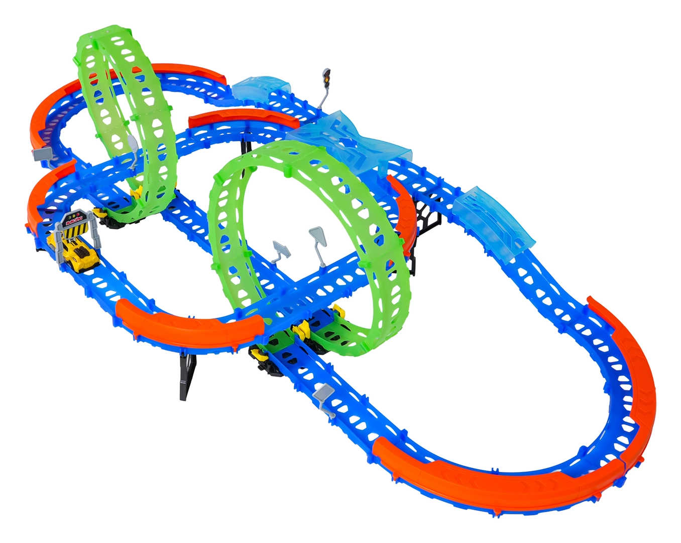 Indítsd be a fantáziát a 3 éves kortól ajánlott szórakoztató versenyszettel! Ez a világító versenypálya 2 darab, 360°-os fluoreszkáló hurkot, éles kanyarokat biztonsági korlátokkal és egy világítással ellátott, gyors kisautót kínál. A 63, könnyen összeilleszthető elemnek köszönhetően a gyerekek saját pályát építhetnek, és sötétben is élvezhetik az izgalmas száguldást.