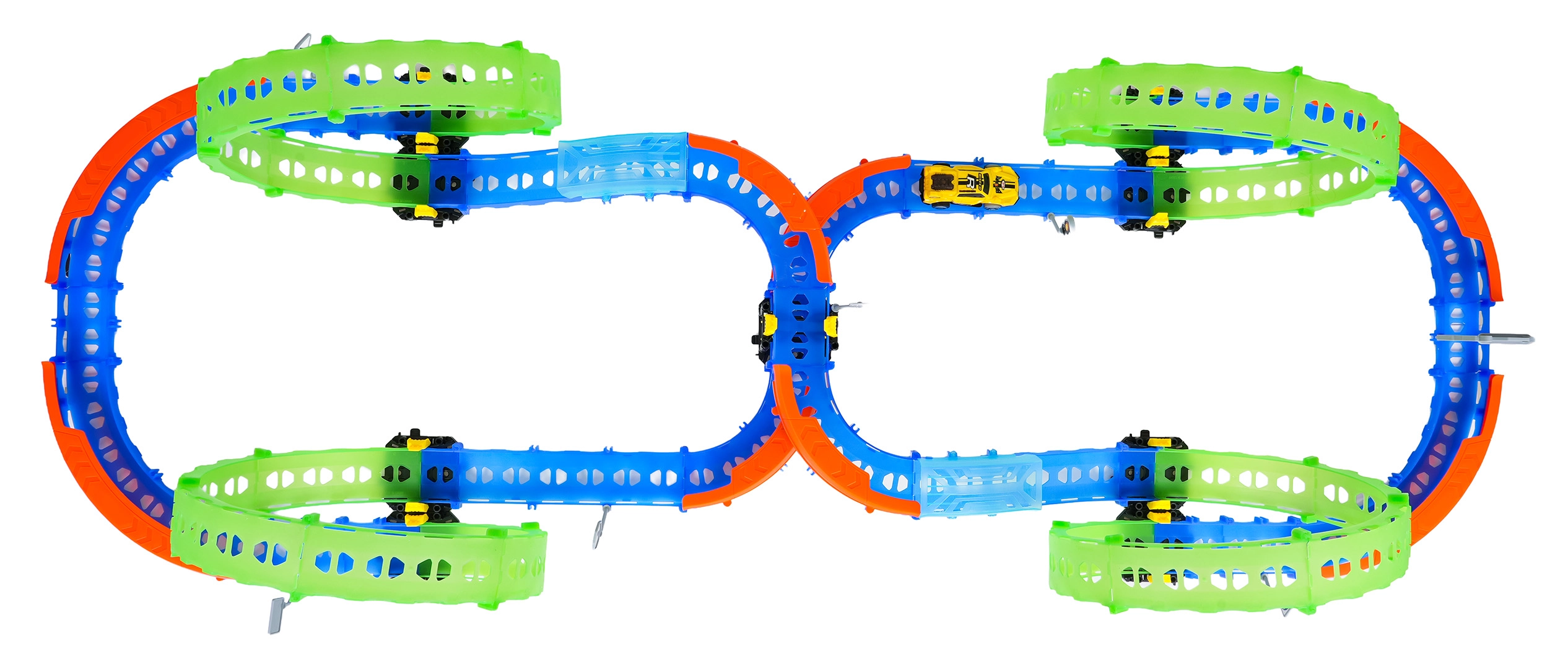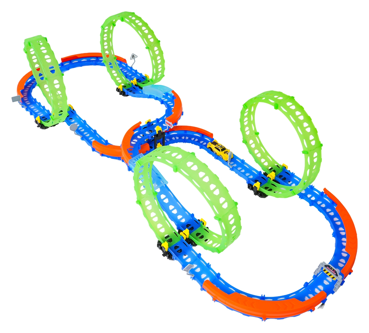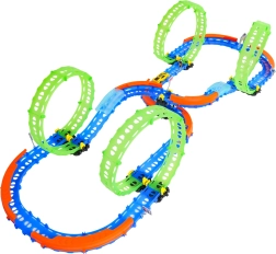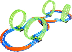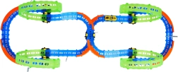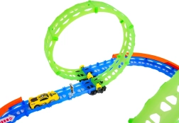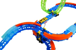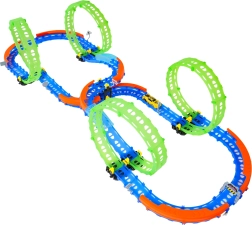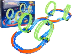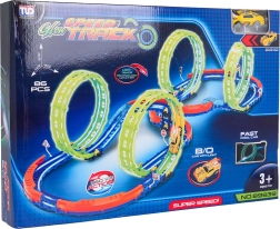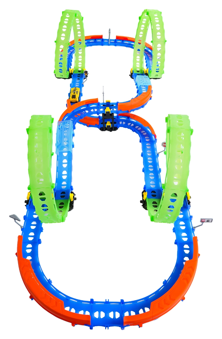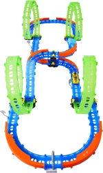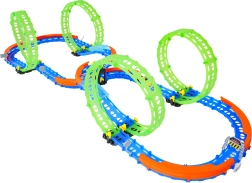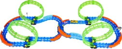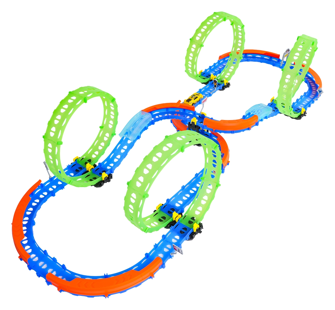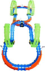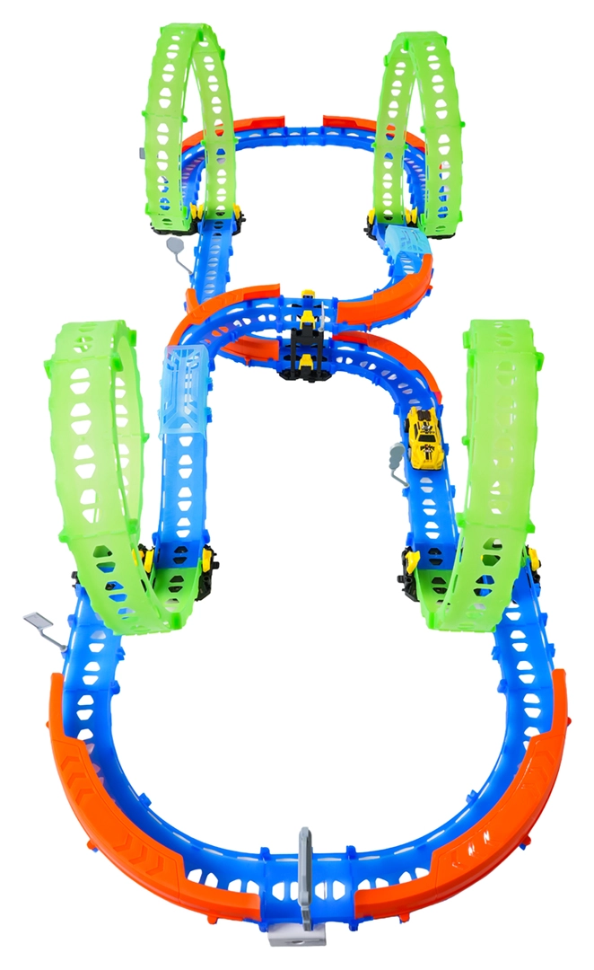 Ez a színes versenypálya remek kaszkadőrmutatványokat és kreatív építést kínál. A fluoreszkáló hurkoknak és a világító kisautónak köszönhetően főként sötétben tündököl, amikor izgalmas, fénylő pályává változik. A robusztus korlátok a kanyarokban segítenek biztonságban tartani az autót a pályán.