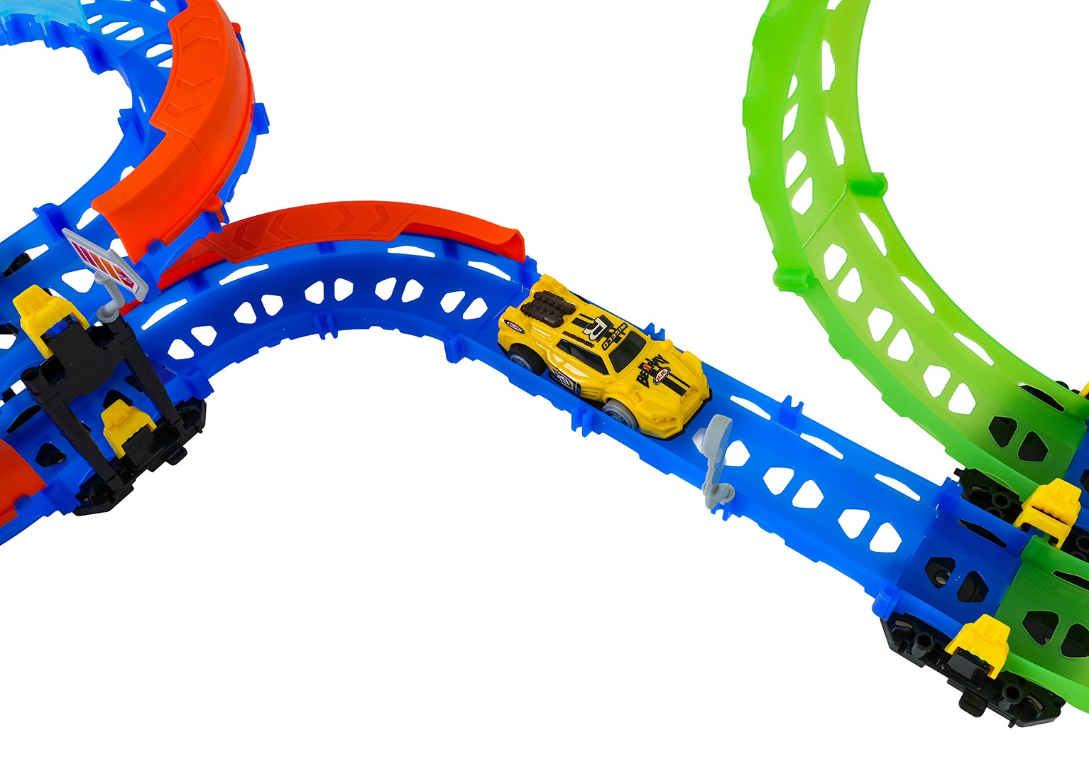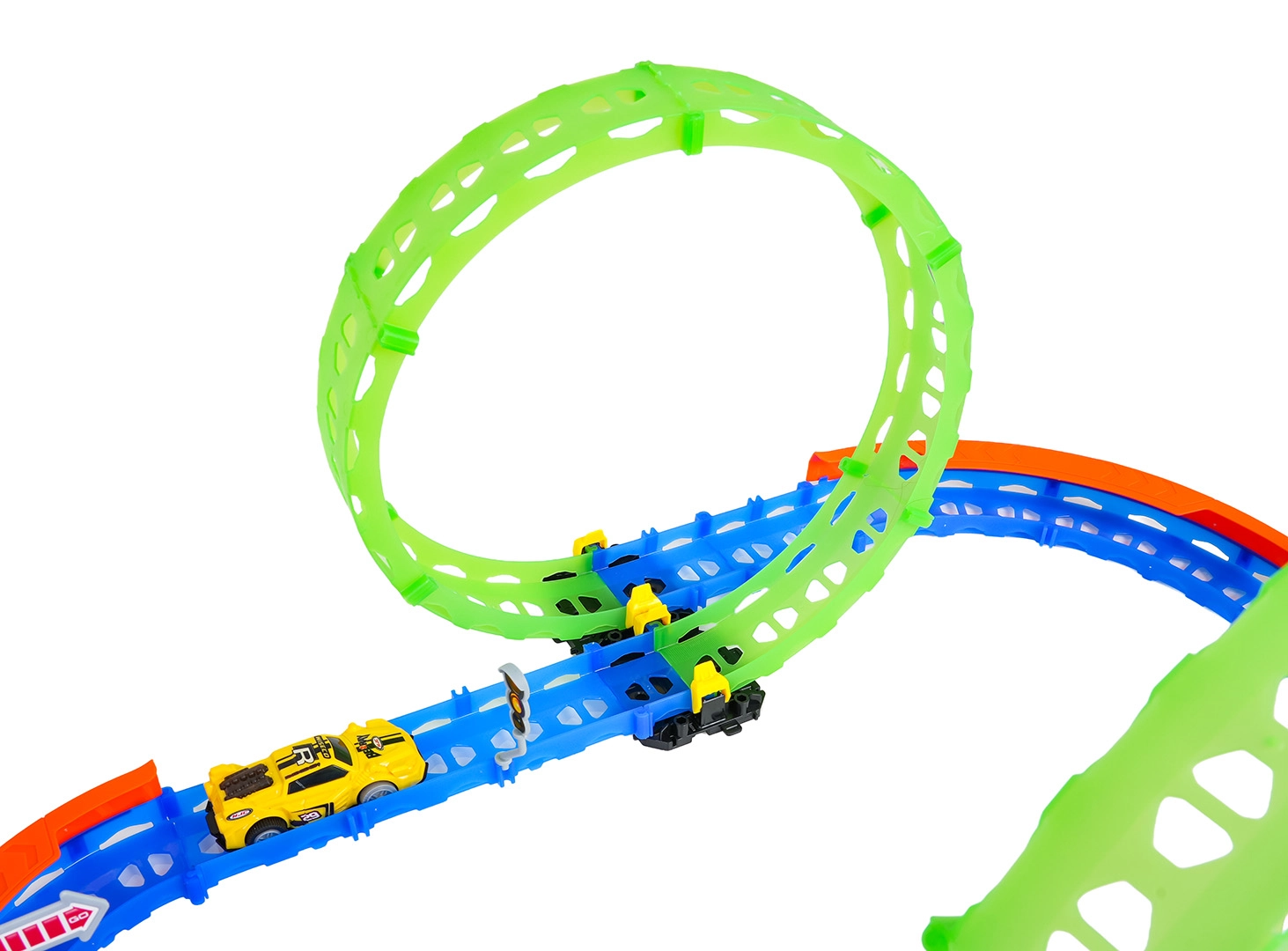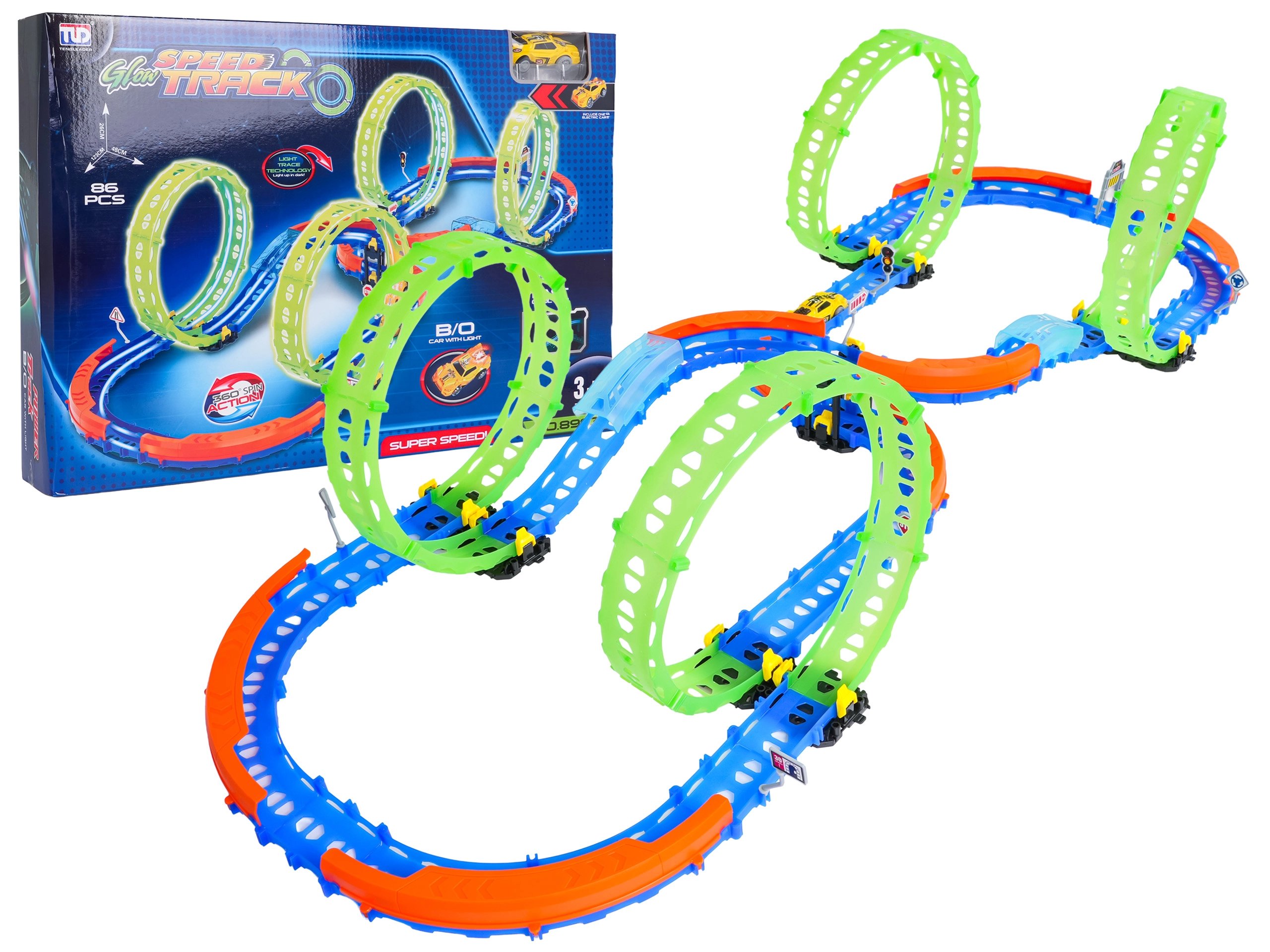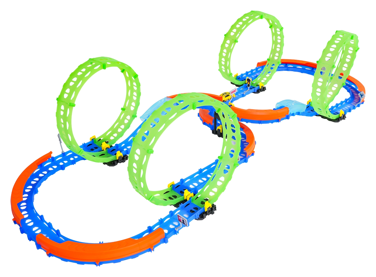Ez a színes versenypálya remek kaszkadőrmutatványokat és kreatív építést kínál. A fluoreszkáló hurkoknak és a világító kisautónak köszönhetően főként sötétben tündököl, amikor izgalmas, fénylő pályává változik. A robusztus korlátok a kanyarokban segítenek biztonságban tartani az autót a pályán.