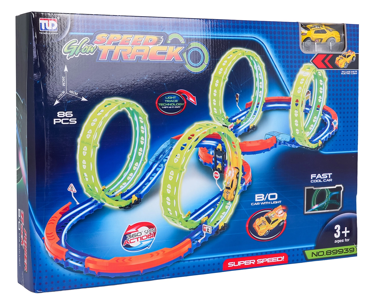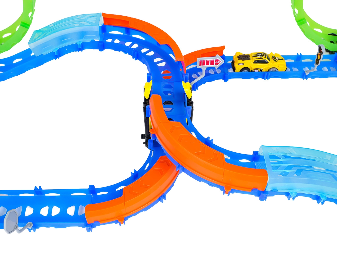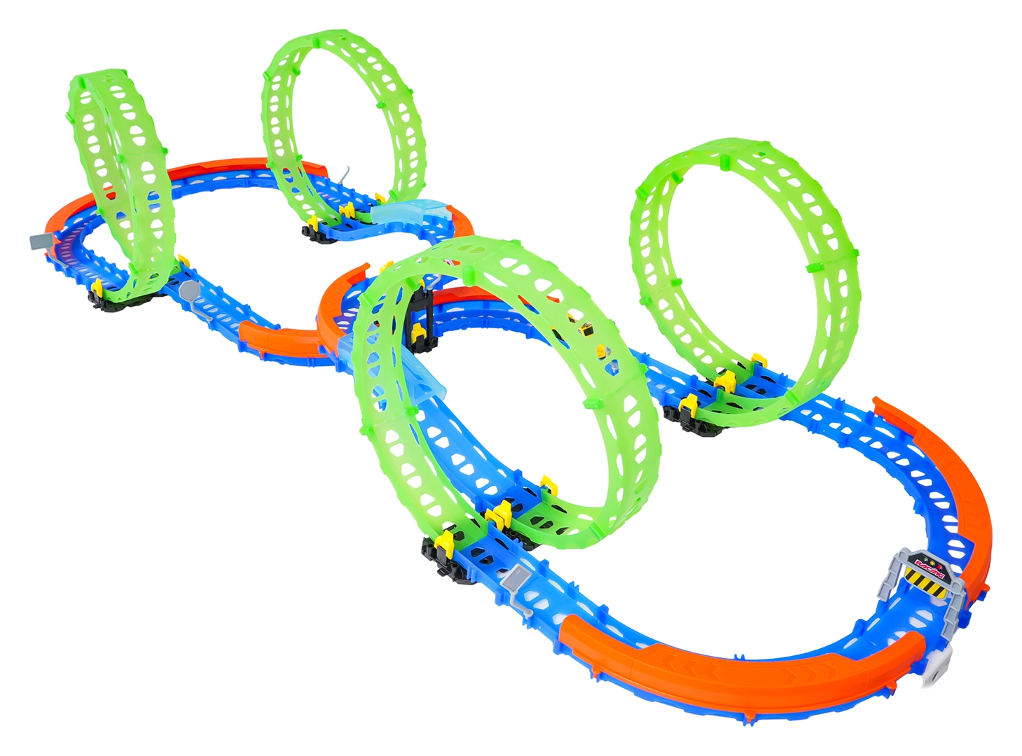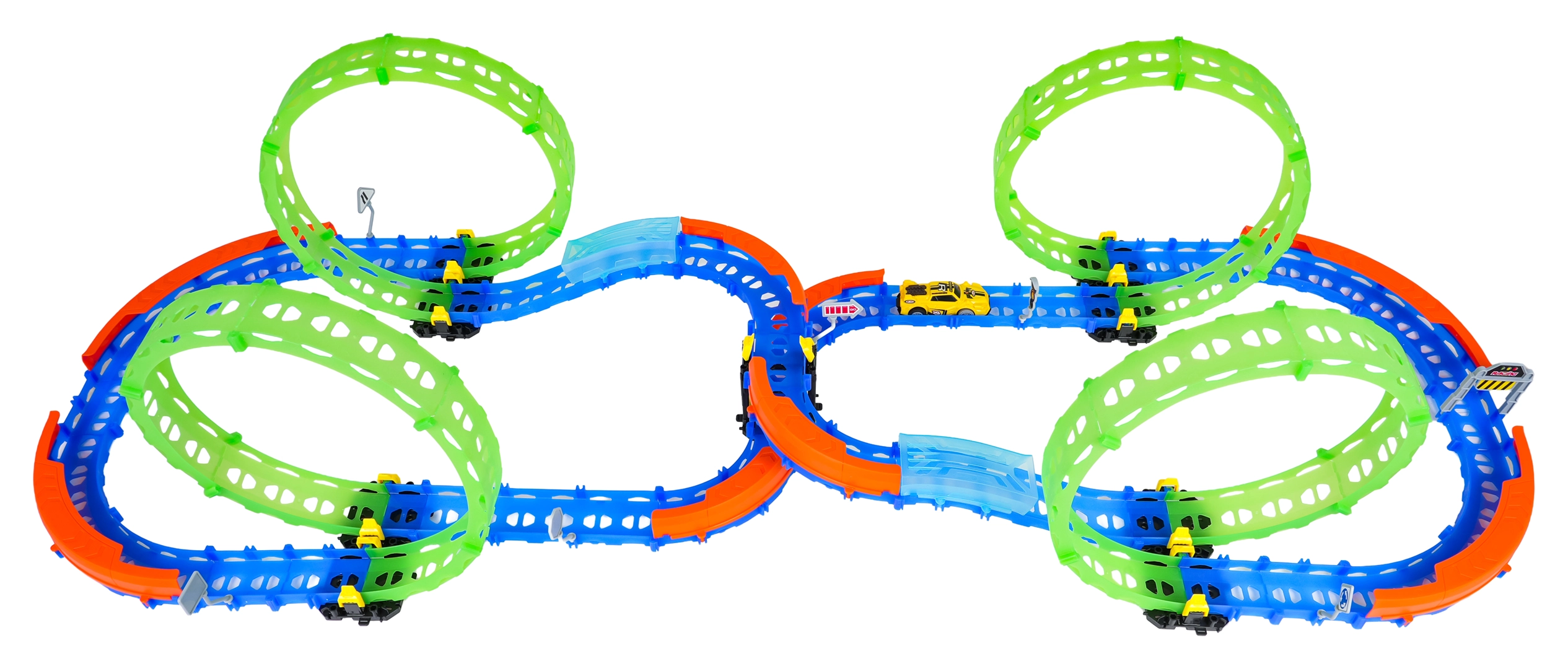 Ez a színes versenypálya remek kaszkadőrmutatványokat és kreatív építést kínál. A fluoreszkáló hurkoknak és a világító kisautónak köszönhetően főként sötétben tündököl, amikor izgalmas, fénylő pályává változik. A robusztus korlátok a kanyarokban segítenek biztonságban tartani az autót a pályán.