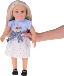 A baba elegáns összeállításba van öltöztetve – csíkos és díszített kék top, sikkes öv és krémszínű, arany motívumos szoknya alkot harmonikus szettet, fekete balerinacipőkkel kiegészítve. A mozgatható karoknak, lábaknak és fejnek köszönhetően a baba könnyen leültethető és különböző pózokba állítható jelenetekhez és történetmeséléshez.