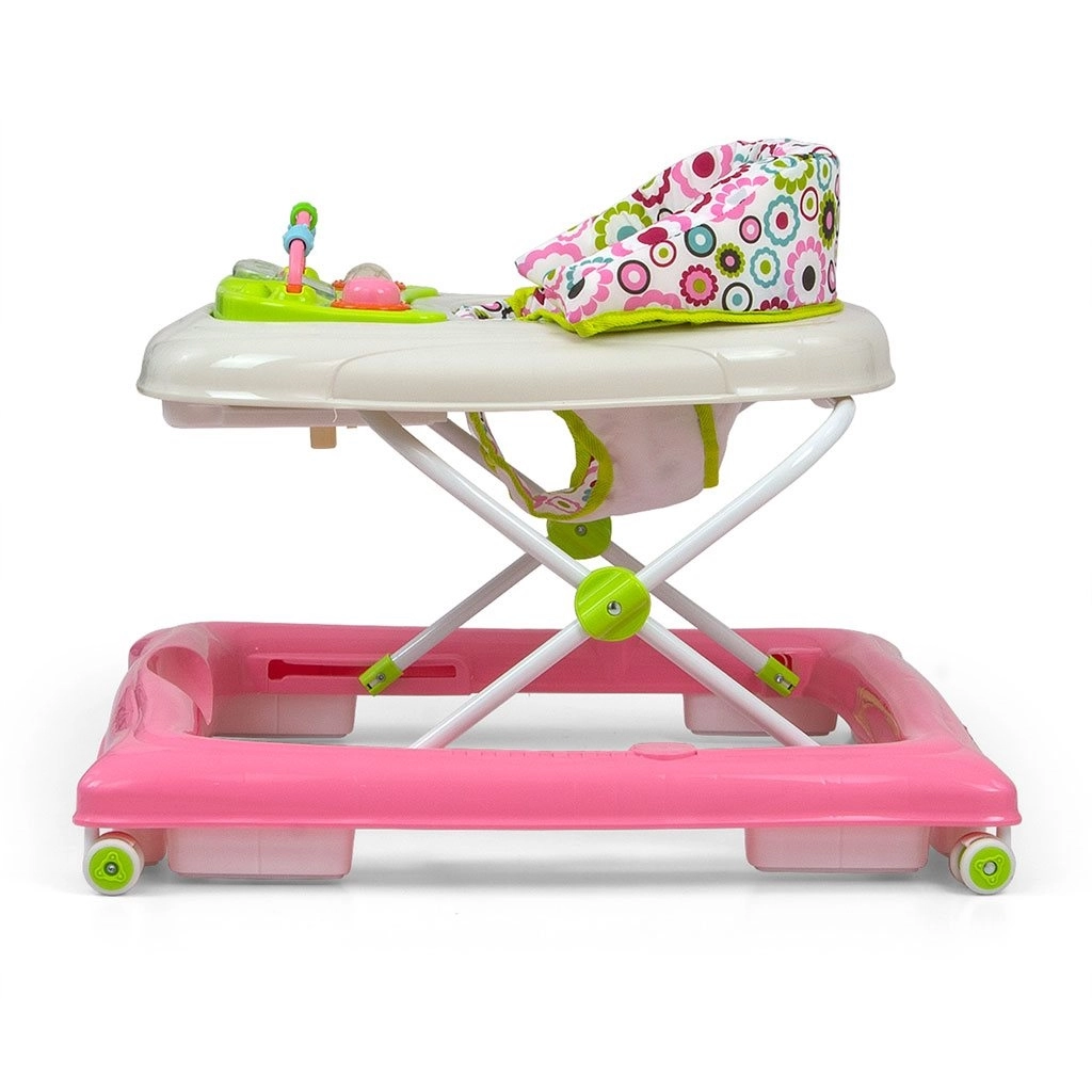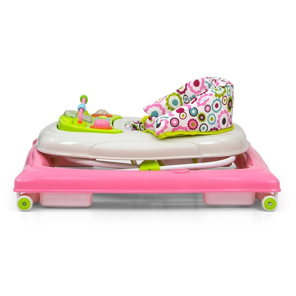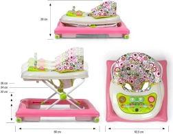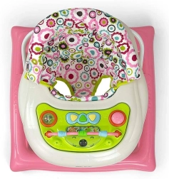 Az interaktív hang- és fény panel fényekkel, dallamokkal, síppal, csörgővel és gombokkal fejleszti az érzékeket és a motorikát. A panel könnyen levehető és önálló játékként is használható utazás közben, míg a tálca játéktálcaként vagy nassolótálcaként szolgál. Négy minőségi, forgó kerék biztosítja a sima mozgást, és nyolc gumis ütköző véd a lépcsőről való lecsúszástól.
