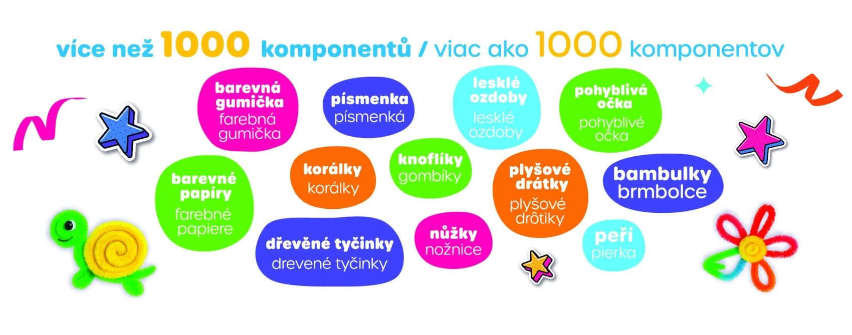 Ez a gazdag készlet fejleszti a gyermek fantáziáját, finommotorikáját és kreativitását. A változatos anyagokkal a gyerekek saját díszeket, állatkákat, virágokat és apró dekorációkat készíthetnek – otthon, óvodában vagy útközben. A praktikus doboz egyben tartja az összes elemet és felgyorsítja a rendrakást.