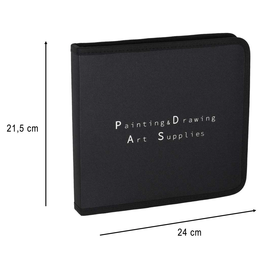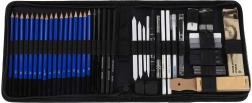 Ez az átfogó vázlatkészlet kezdők és haladók számára egyaránt ideális. Tartalmaz grafitceruzákat 12B-től 5H-ig, fekete és fehér szénceruzákat, stifteket a nagy felületi húzásokhoz és papír estompokat a finom tónusátmenetekhez. Minden átláthatóan rendezve egy strapabíró nejlontokban, amely biztonságosan tartja a felszerelést.