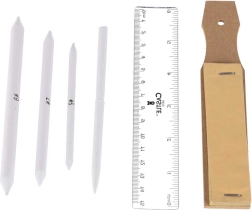 Különböző méretű papír tortillonok (estompek), csiszolólap és vonalzó a tiszta átmenetekhez, részletekhez és pontos vonalakhoz.