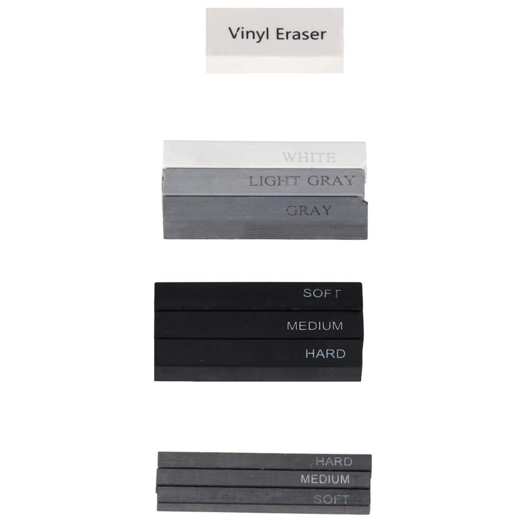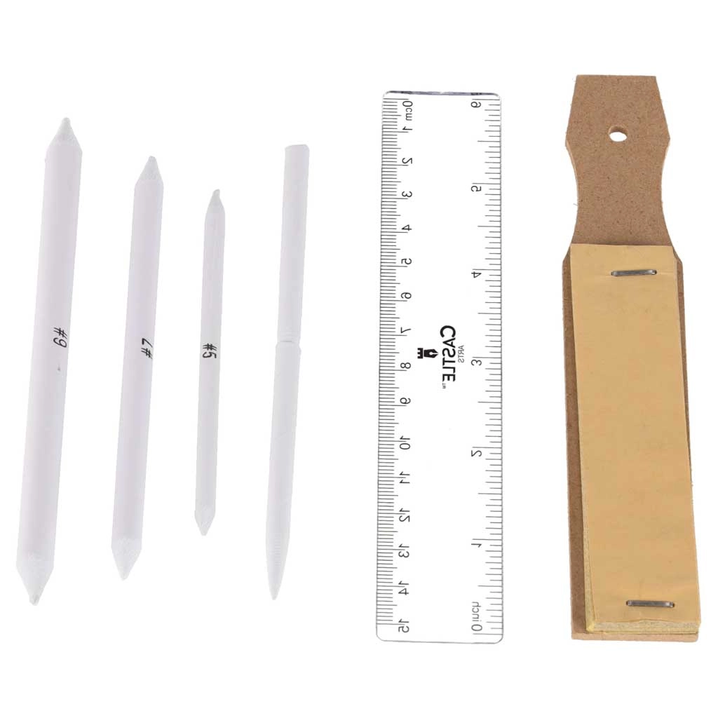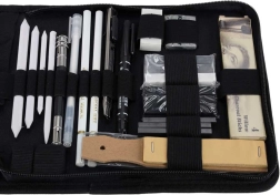 A fények kiemeléséhez használja a fehér zselés tollat és a fehér szénceruzákat, a korrekciókhoz pedig a vinyl és gyurmaradírt. Nem hiányoznak a hegyezők, a ceruzahosszabbító, a vonalzó és a csiszolólap sem a tökéletes hegyformához.