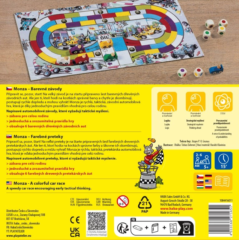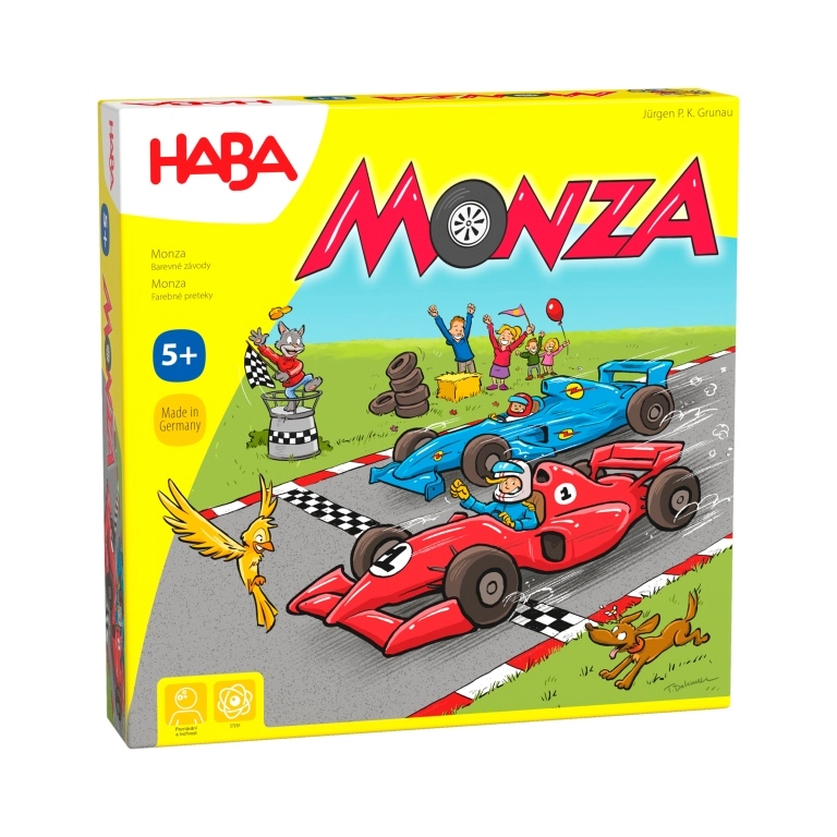 A Haba Monza című szórakoztató családi játéka gyors versenyeket kínál taktikával és szerencsével fűszerezve. A egyszerű szabályoknak köszönhetően gyerekeknek és felnőtteknek egyaránt ideális, 2–6 játékos részére, egy parti pedig mindössze kb. 15 percig tart.