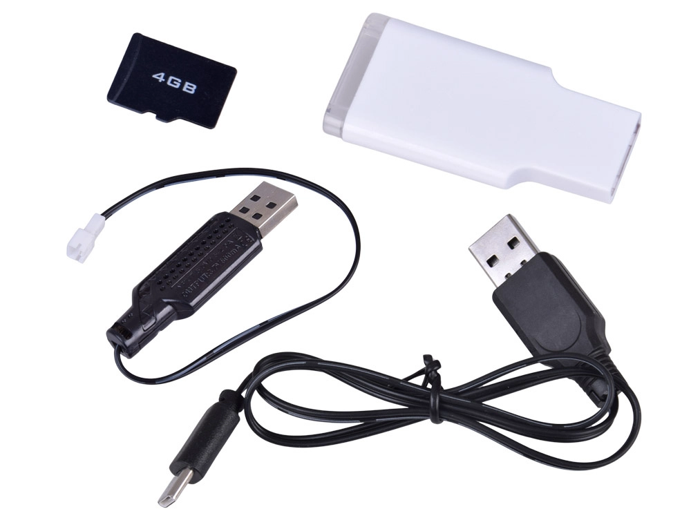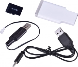 RC autó, kijelzős vezérlő joystickokkal, USB kábel az autóhoz, USB kábel a vezérlőhöz, 4 GB microSD kártya olvasóval, csavarhúzó