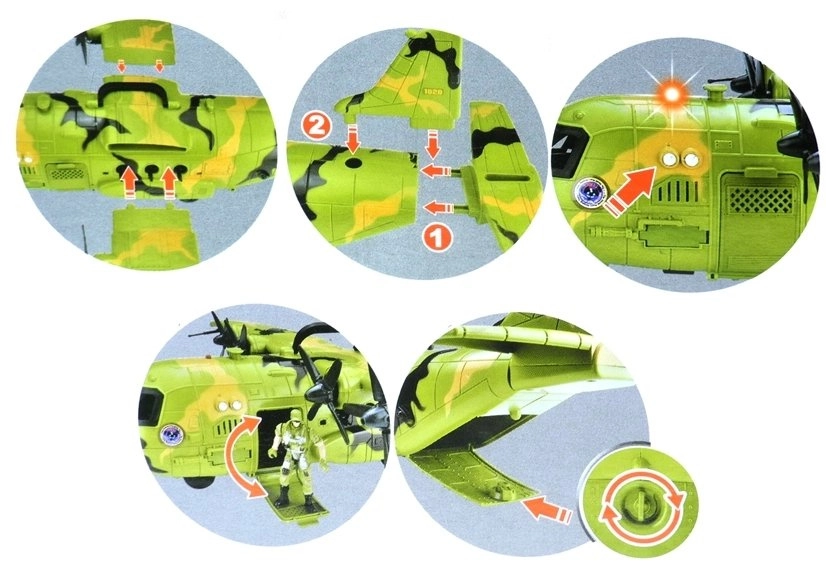 A modell nyitható első és hátsó ajtókkal rendelkezik a figurák könnyű elhelyezéséhez, forgó légcsavarokkal és mozgatható fegyverzeti elemekkel. A csomagban 3 katonai figura is található, amelyekkel a gyerekek saját szállítási és mentési küldetéseket alkothatnak.
