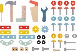 A gumicsíkokkal ellátott kerekeknek köszönhetően a gurulás halk és padlókímélő. Az ergonomikus fogantyú jól illik a gyerekek kezébe, a hátsó szerszámos rekesz pedig minden alkatrészt befogad. A csomag része egy gazdag készlet fából készült szerszámokkal és kötőelemekkel, végtelen építési variációkhoz.