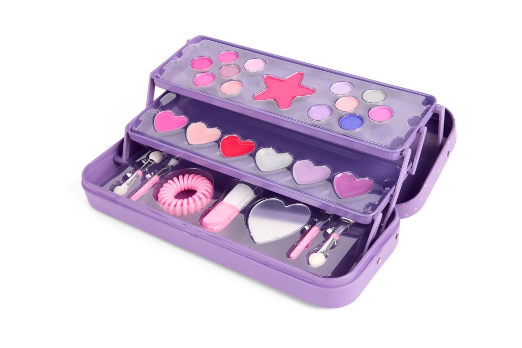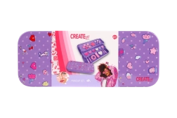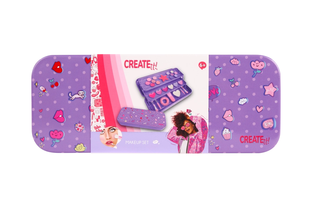 Stílusos, lila CREATE IT! sminkkészlet praktikus fémdobozban mindennel, amire a kis divatrajongóknak szükségük lehet. A háromszintes kivitelben 10 szemhéjpúder, pirosító, 6 ajakfény, ecsetek, hajgumi és szívecske alakú tükör kapott helyet. A kihajtható kialakításnak köszönhetően az összes tartalom átlátható és könnyen elérhető – ideális utazáshoz és otthoni sminkeléshez egyaránt.