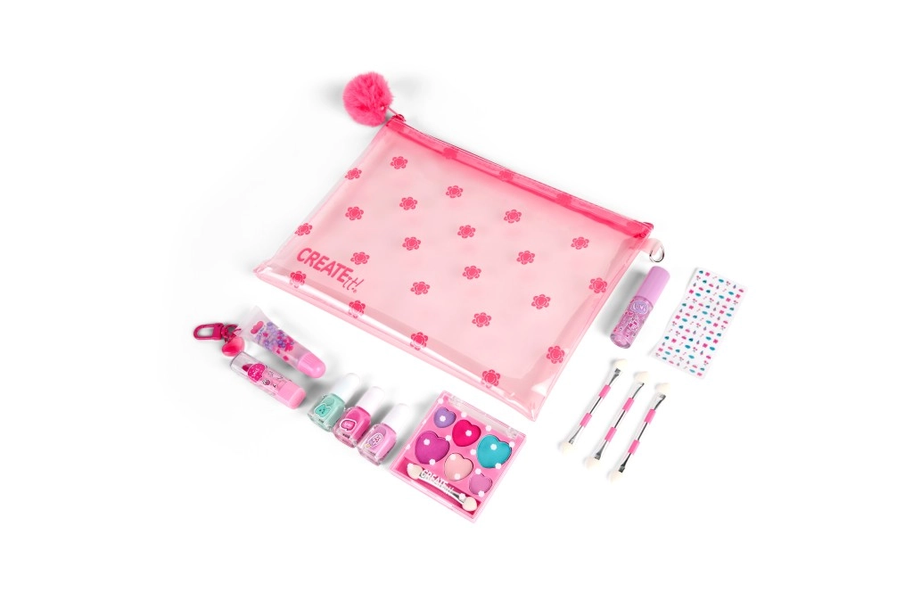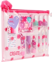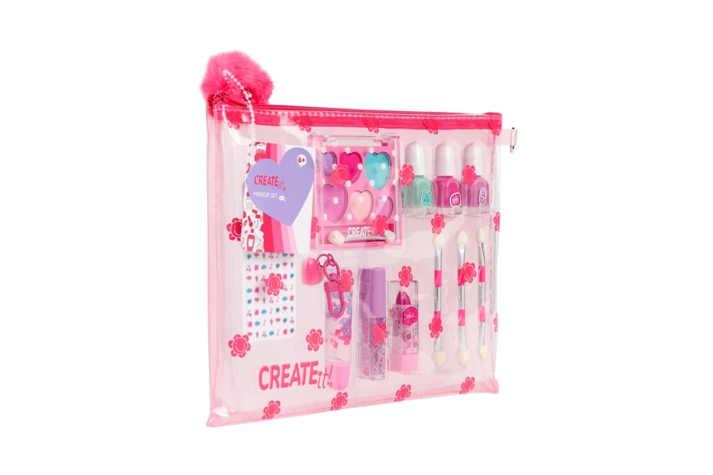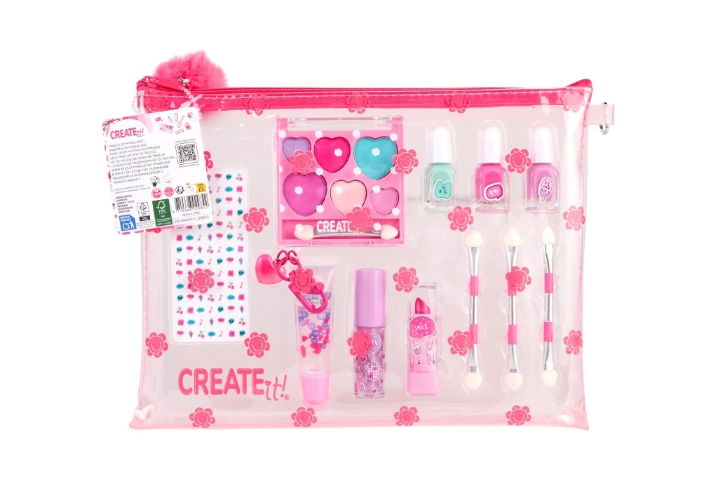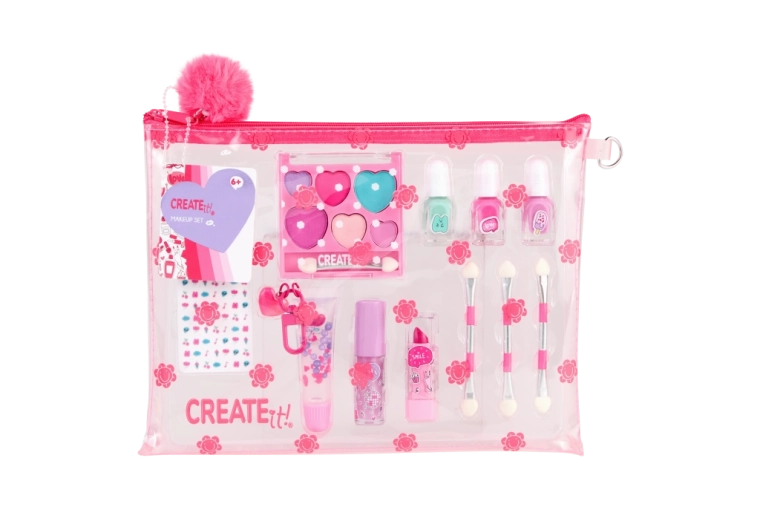 A bájos, átlátszó neszesszerben lévő gyermek sminkkészlet ideális a kis parádésoknak. Mindent tartalmaz a játékos sminkeléshez és körömdíszítéshez: 3 körömlakkot, ajakfényt, ajakbalzsamot, 3 applikátort és körömmatricákat. A praktikus pomponos neszesszer díszít, és egyben rendben tartja az összes kiegészítőt.