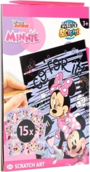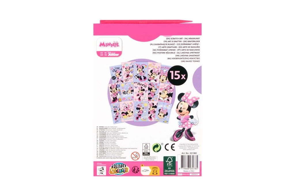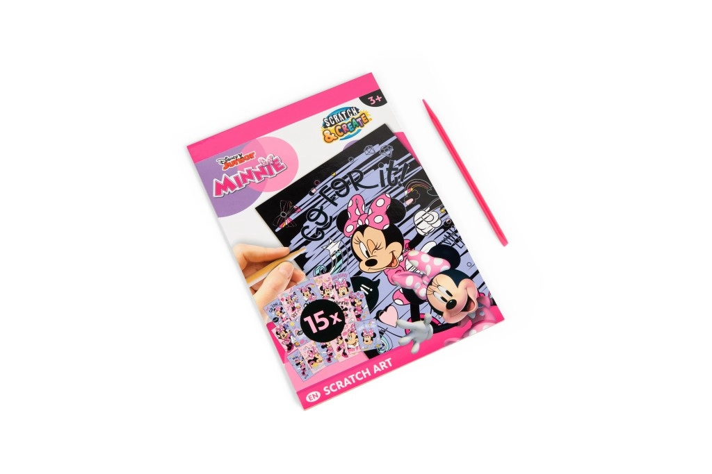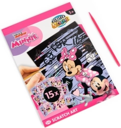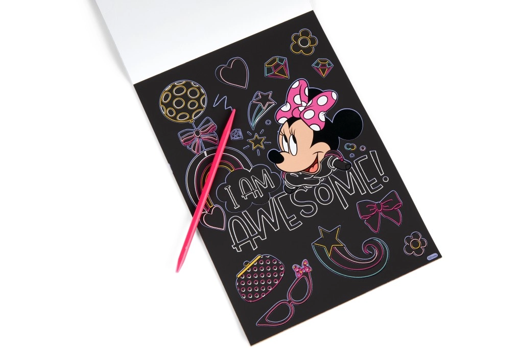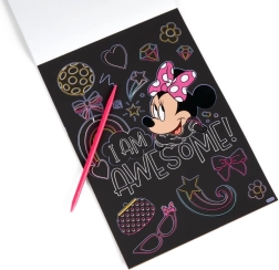 A fekete réteg alatt élénk színek és MINNIE motívumok rejtőznek, amelyeket a gyerekek a kaparóval fednek fel – egyszerű, szórakoztató és „ragadós” alkotás.