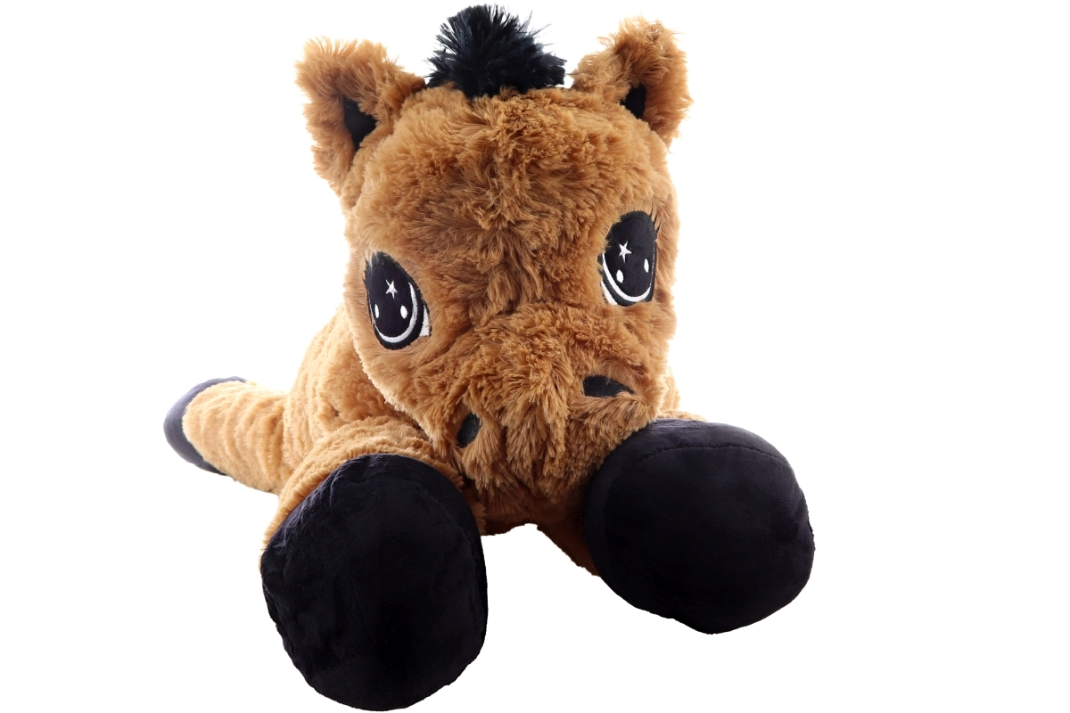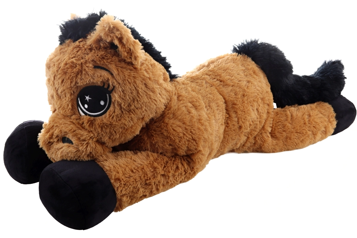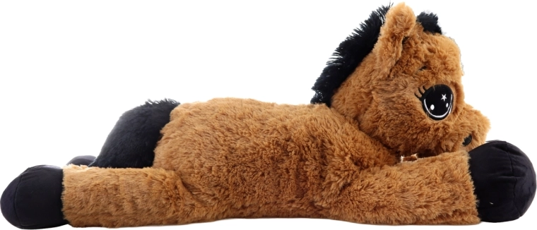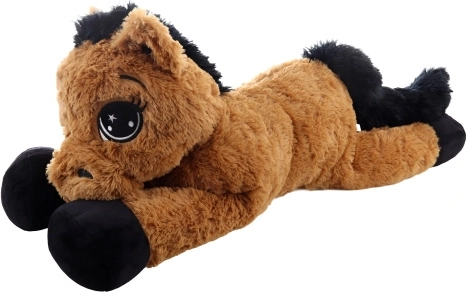 Ez a barna, fekvő plüss ló már az első érintésre elbűvöl. Nagy, hímzett szemei vannak, puha sörénye és farka, így egyszerre szeretgetnivaló barát és kényelmes támasz olvasáshoz vagy mesenézéshez. A 80 × 32 × 25 cm-es méretek biztosítják a bőséges helyet az öleléshez és a pihenéshez.