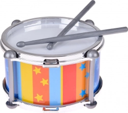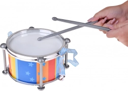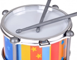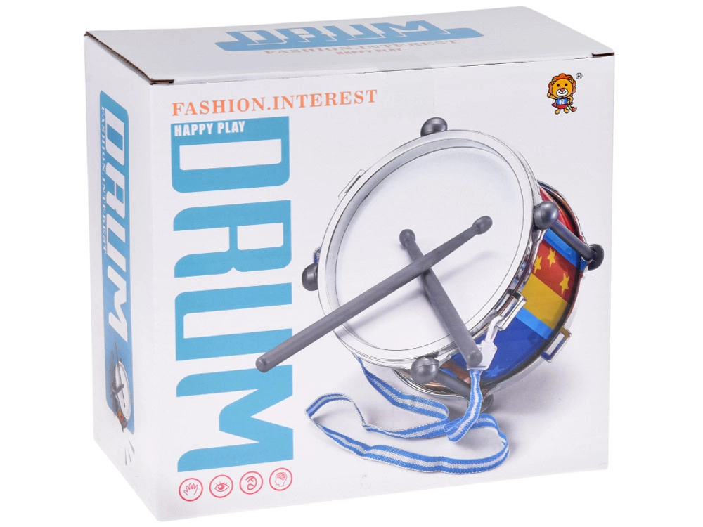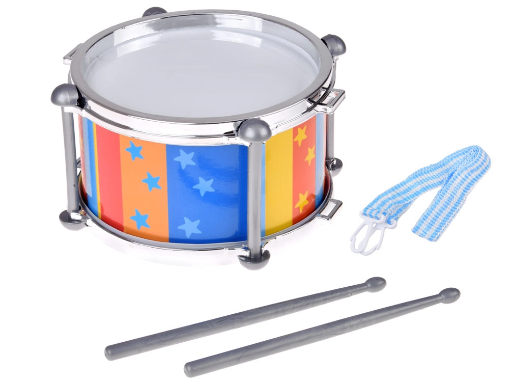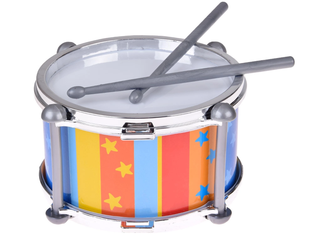 A színes, függőleges csíkok csillagokkal és a fémhatású peremek vonzó játékká és ajándékká teszik a dobot. A dobolás fejleszti a finommotorikát, a kéz–szem koordinációt, a hallási észlelést és a természetes zenei érzéket.
