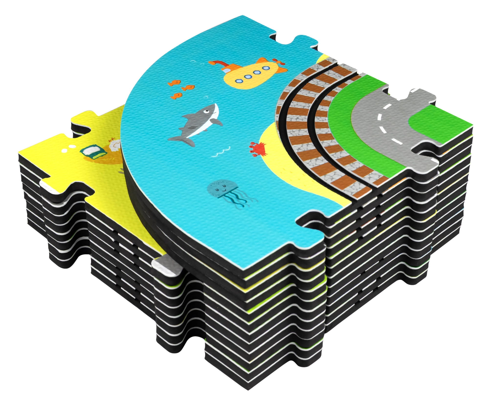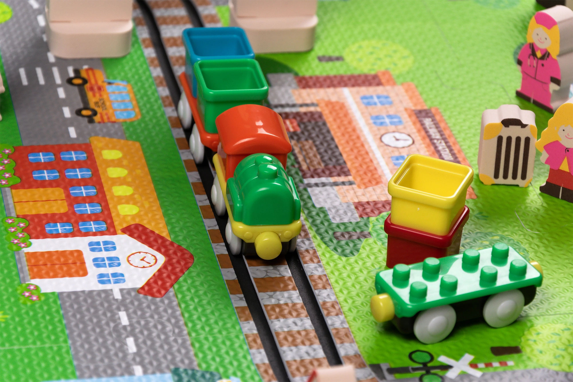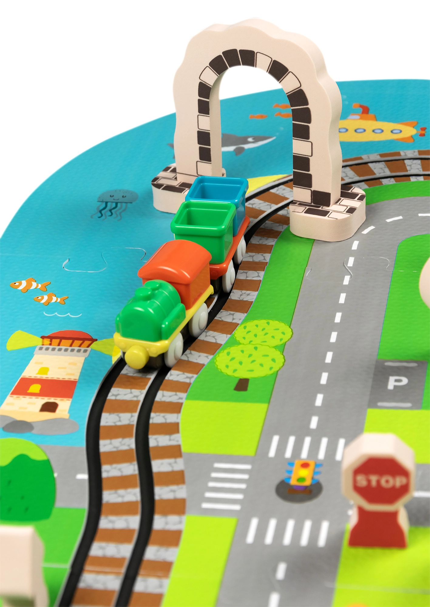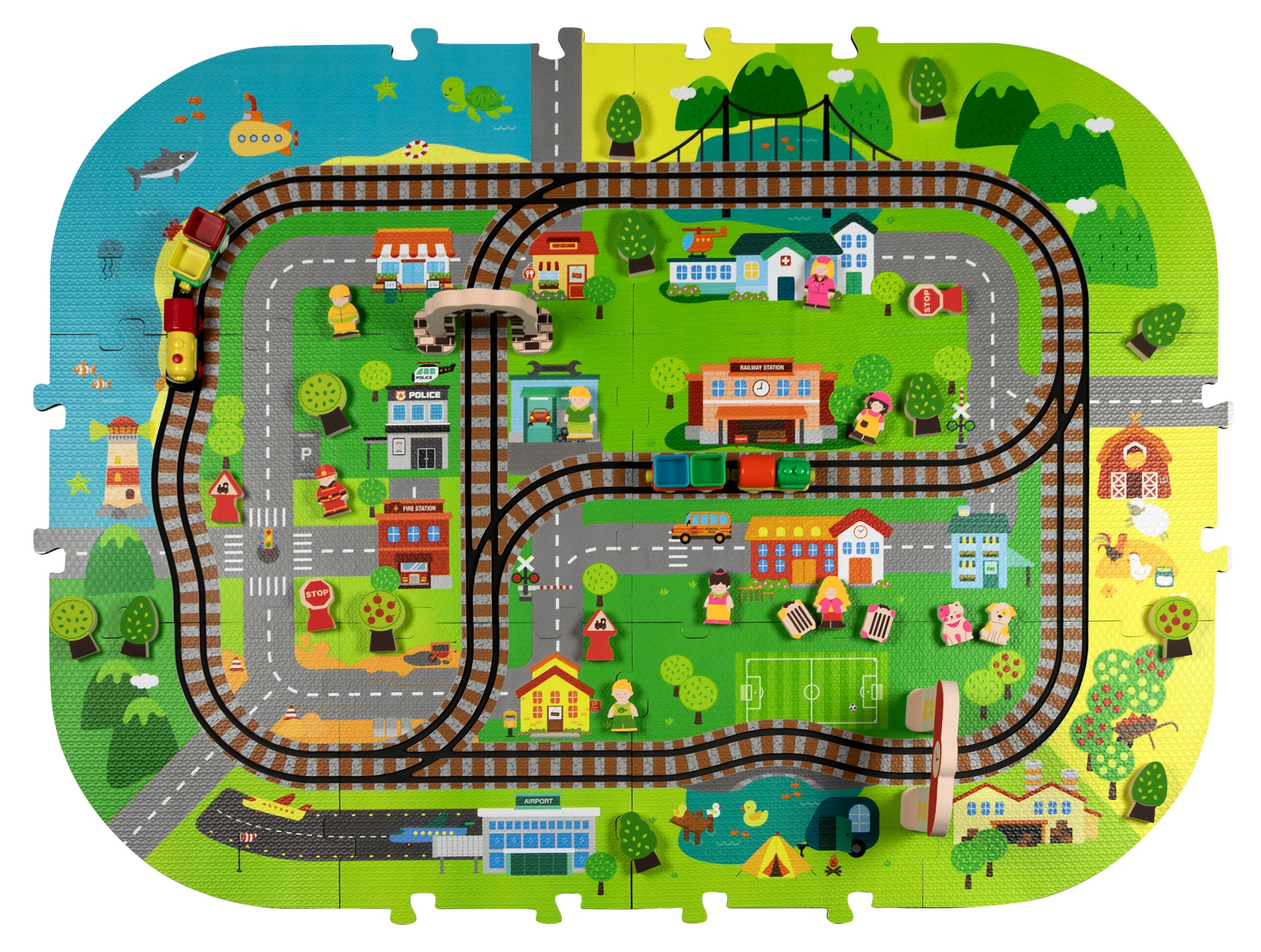 Illessze össze az elemeket, mint egy kirakót, és alkossa meg saját városát utcákkal, sínekkel, épületekkel és természeti elemekkel. A vastag EVA darabok tartják a formájukat és könnyen tisztíthatók.