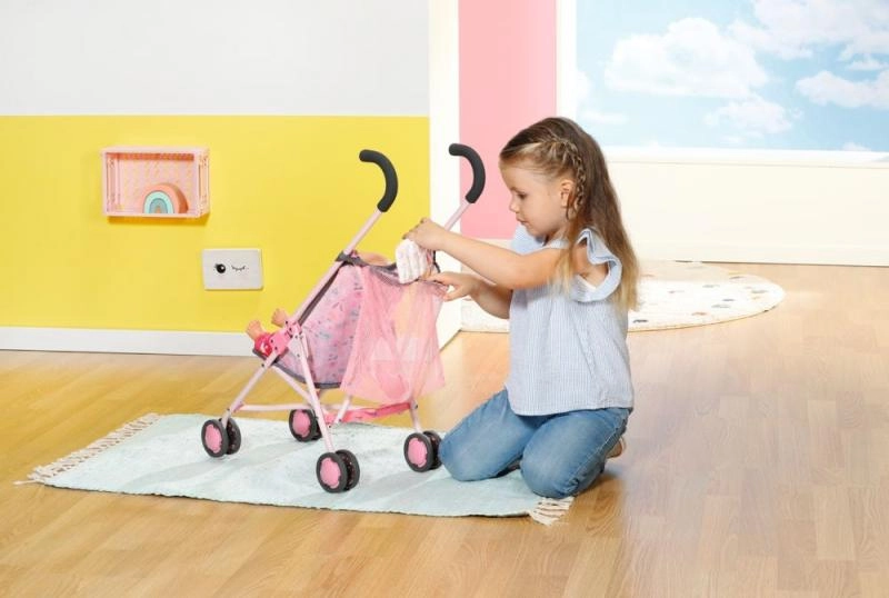 A BABY born babakocsi tökéletes a mindennapi sétákhoz és az otthoni játékhoz. A könnyű fém váz, a kényelmes habos fogantyúk és a négy dupla kerék megkönnyíti a kezelést a kis kezek számára is. A vidám mintás ülés biztonsági övekkel van felszerelve, amelyek megbízhatóan a helyén tartják a babát.