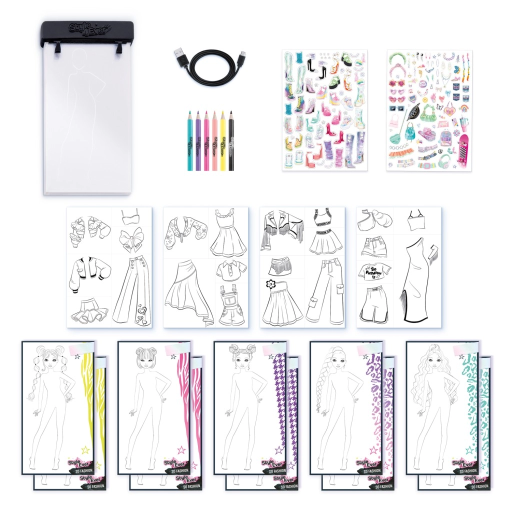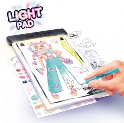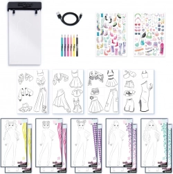 Ez a stílusos készlet ideális a kis divatrajongóknak, akik igazi tervezőként szeretnének alkotni. A megvilágított rajztábla megkönnyíti az átrajzolást és a sablonok rétegezését, így a szép és tiszta tervek pillanatok alatt elkészülnek. A gazdag tartalomnak köszönhetően különböző sziluetteket, kiegészítőket és színeket kombinálhatsz, és egyedi kollekciókat hozhatsz létre.