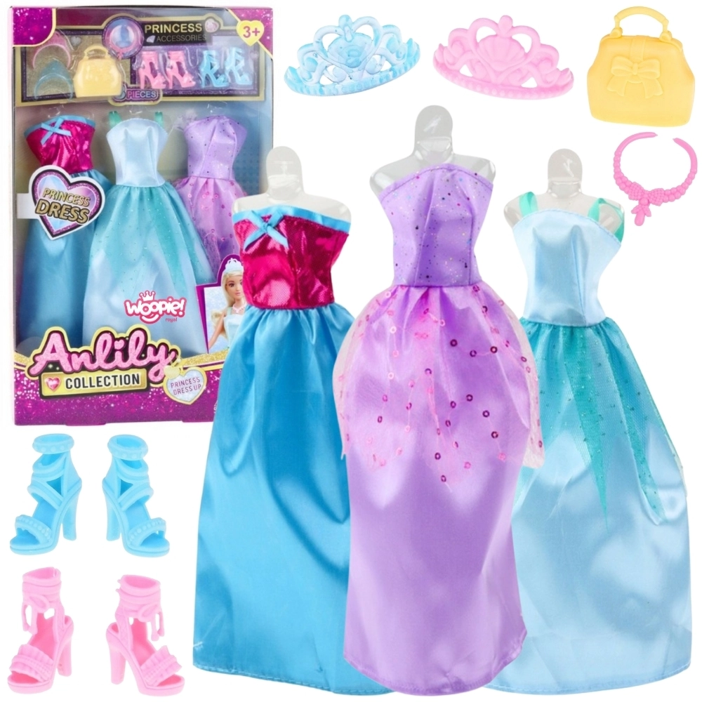 - 11 részes szett – ruhák, cipők, koronák, táska és nyaklánc számtalan kombinációhoz.