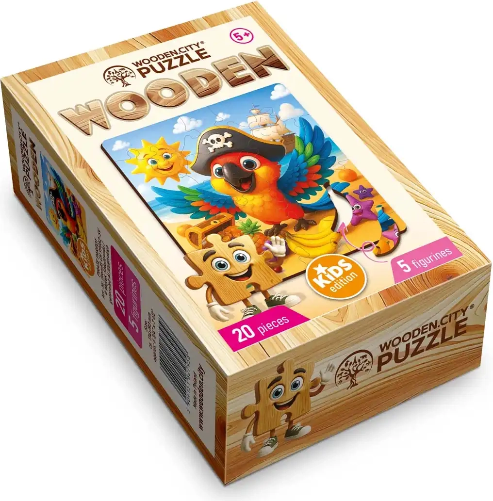 A WOODEN CITY Kalózpapagáj fa puzzle ideális választás első kirakónak vagy szórakoztató ajándéknak. Gondos kidolgozása és szép motívuma révén a gyerekek minden egyes darabot élvezni fognak, miközben lépésről lépésre megalkotják a kalózstílusú papagájt ábrázoló, elbűvölő jelenetet.