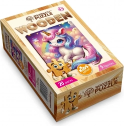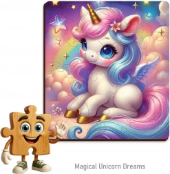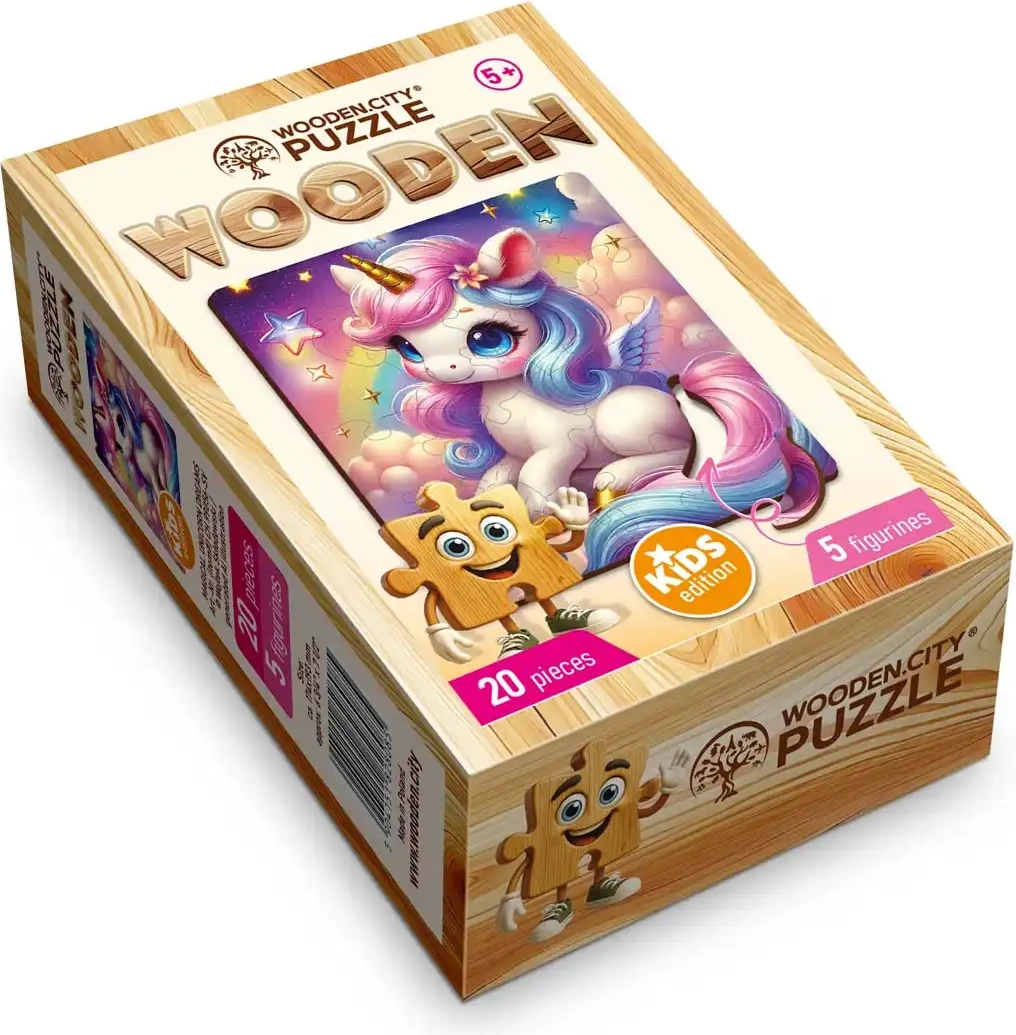 A WOODEN CITY gyerek fa puzzle varázslatos egyszarvús motívummal örömet szerez a mesék kis rajongóinak. A minőségi kivitel, kellemes színek és átgondolt formák támogatják a finommotorikát és a logikus gondolkodást. Kompakt méretének köszönhetően otthonra és utazáshoz is ideális.