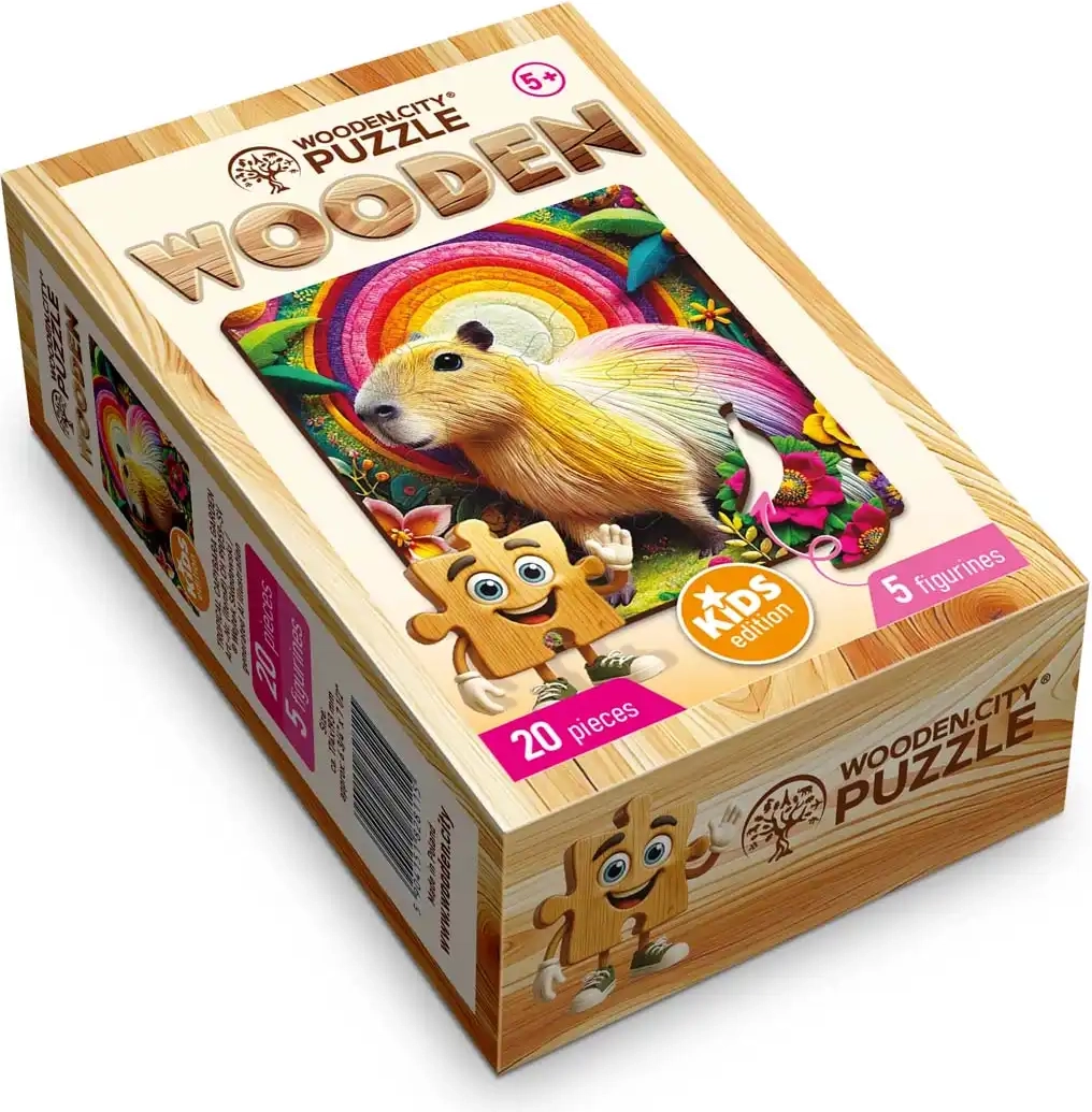 Ez a bájos kapibarás kirakó örömöt és sikerélményt nyújt a gyerekeknek a kép befejezésekor. A minőségi kivitelezésnek köszönhetően az elemek tartósak, pontosan illeszkednek és kellemes tapintásúak. Ideális ajándéknak, illetve első lépésként a fa puzzle-ök világába.