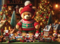 Színes ünnepi jelenet mackóval, mini házikókkal, fenyőfákkal és kisvonattal – garantáltan megteremti az igazi karácsonyi hangulatot, és összerakva dekorációnak is ideális.