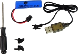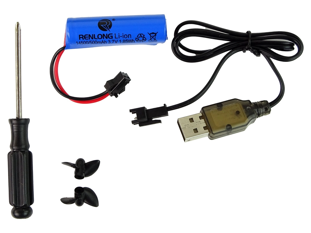 - Vezérlő, akkumulátor, USB kábel, 2 propeller/csavar, állvány, csavarhúzó, használati útmutató