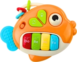 A zenélő halacskás zongorácska ideális első zenés játék a tipegőknek. A négy, jól jelölt Do, Re, Mi, Fa billentyű megnyomásakor vidám dallamok és egyes hangok szólnak, ezzel természetes módon fejlesztve a ritmusérzéket és a hangok észlelését. Az ergonomikus halacskaforma kényelmesen simul a kis kézbe, a könnyű test és a sima, lekerekített élek biztonságos és kényelmes használatot biztosítanak.