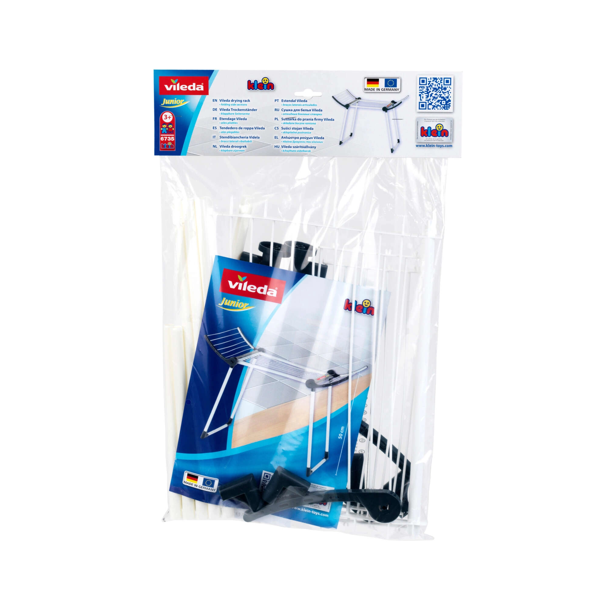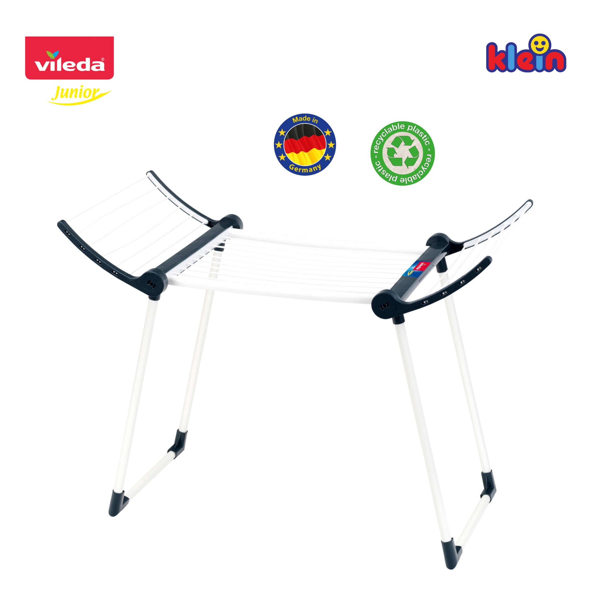 A KLEIN márkájú, valósághű Vileda gyerek ruhaszárító a valódi szárító hű mása, és biztonságos, szórakoztató módon teszi lehetővé a házimunkák utánzását. Részletgazdag kidolgozással készült, stabil, dupla lábakkal, két lehajtható oldallal és alacsony súllyal rendelkezik. A kompakt méretre való összehajtás lehetőségének köszönhetően nem foglal helyet, amikor nincs használatban.