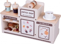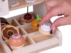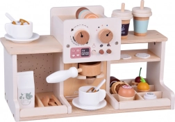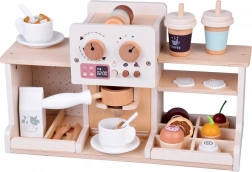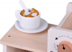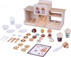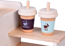 Fedezze fel a barista világának varázsát ezzel a fából készült kávézóval, amely úgy néz ki és úgy működik, mint az igazi. A gyerekek forgatható gombokkal „állíthatják” a kávé erősségét, behelyezhetik a kart/portafiltert, választhatnak kapszulák közül kávéhoz vagy teához, „habosíthatják” a tejet és desszerteket szolgálhatnak fel tányérokon. A masszív fa szerkezet biztonságos festékekkel és lágy pasztell színvilággal hosszú élettartamot és szép megjelenést garantál a gyerekszobában.