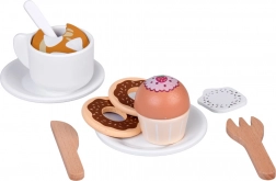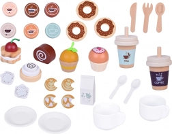 A gazdag tartozékkészlet tartalmaz csészéket csészealjjal és kanalakkal, elviteles poharakat tetőkkel (Tea, Coffee), tejesdobozt, evőeszközöket, különféle sütiket, muffinokat, kekszeket és csokikat, valamint egyszerű menüt. Minden elem a kis kezekhez igazodik, és támogatja a finommotorikát, a kéz–szem koordinációt és a szociális készségeket.