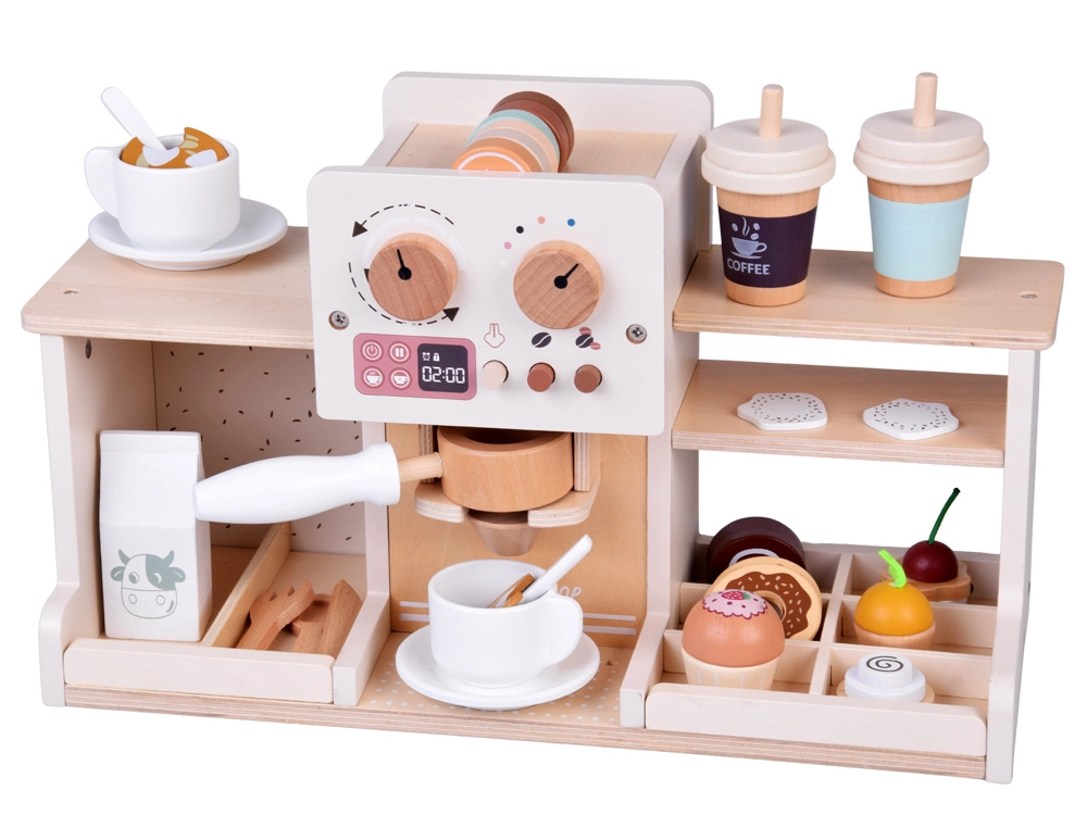 A forgatható gombok, az ikonnyomatok és a kar (kolba) valódi kávékészítés érzetét keltik. A gyerekek fa kapszulákat helyezhetnek be, és „beállíthatják” az ideális italt.