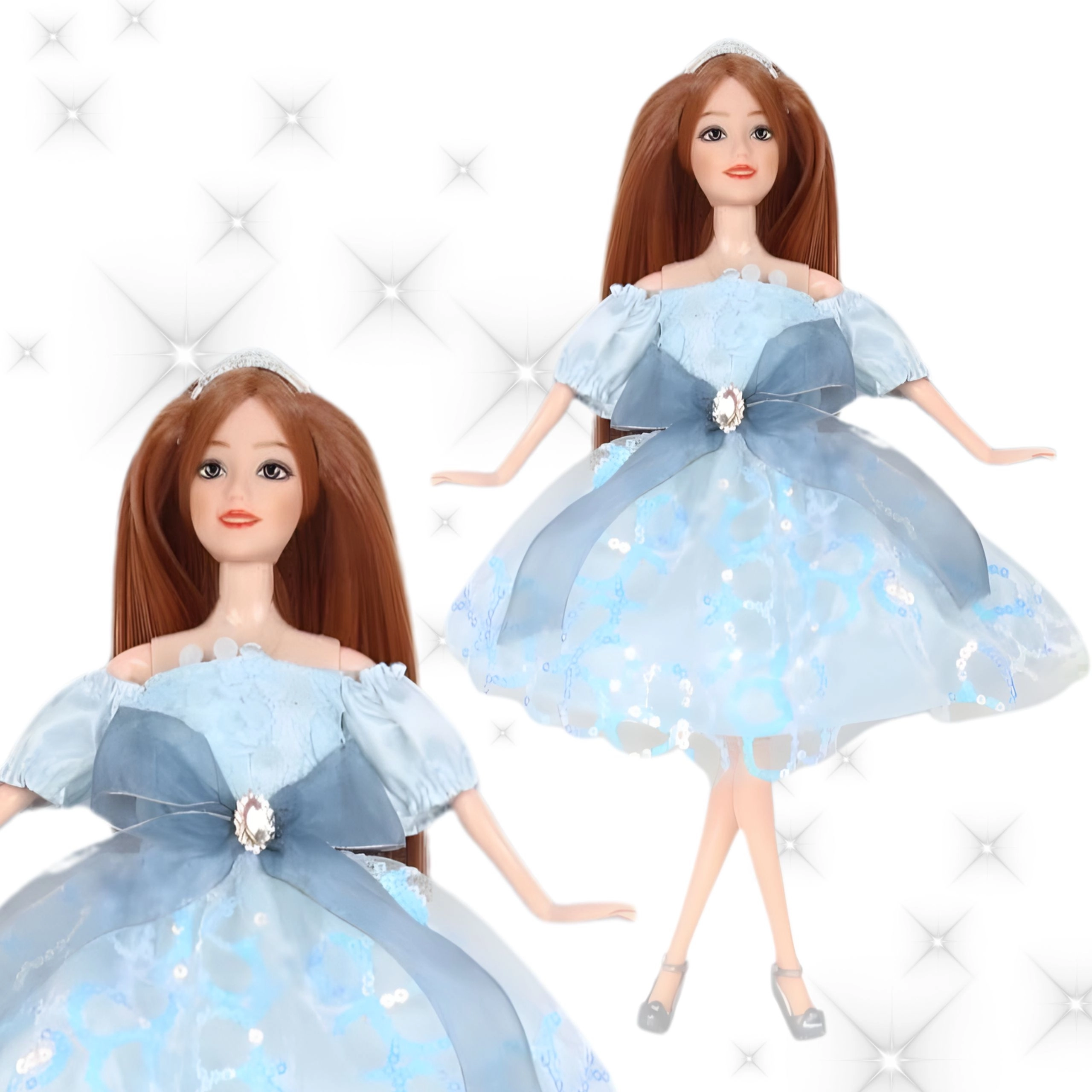 Az elegáns Emi baba égszínkék ruhában, finom tülllel és masnival minden gyermeket elbűvöl. Hosszú barna haja, stílusos koronája, mozgatható végtagjai vannak, és biztonságos, tartós anyagokból készült. Remek ajándék 3 éves kortól, esztétikus csomagolásban.