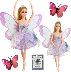 Fedezd fel a fantázia világát a Emi tündér babával, amely elbűvölő csillogó pillangószárnyakkal, pasztell lila ruhával és mozgatható végtagokkal varázsol. Az elegáns korona, a stílusos cipők és a biztonságos anyagokból készült, minőségi kidolgozás minden játékot varázslatos történetté változtat – remek ajándékötlet.