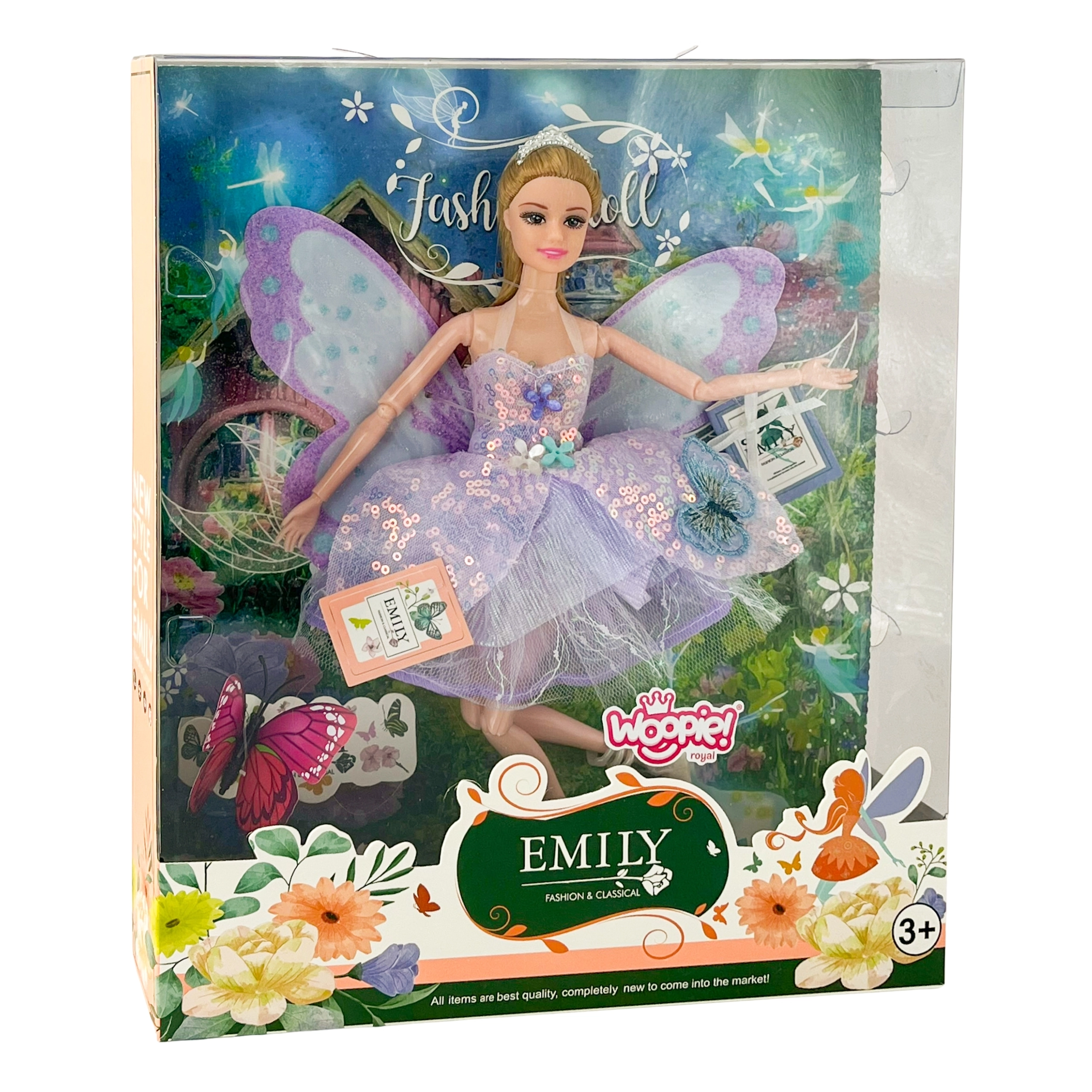 A Woopie Royal Emi tündér baba a mesevilág rajongóinak készült. A lila finom pasztell árnyalatai, a csillogó díszítés és a könnyű tüllszoknya bájos megjelenést kölcsönöz, amely minden gyerekszobában ragyog. A mozgatható végtagoknak és a levehető pillangószárnyaknak köszönhetően a gyerekek saját varázslatos jeleneteket és történeteket alkothatnak.