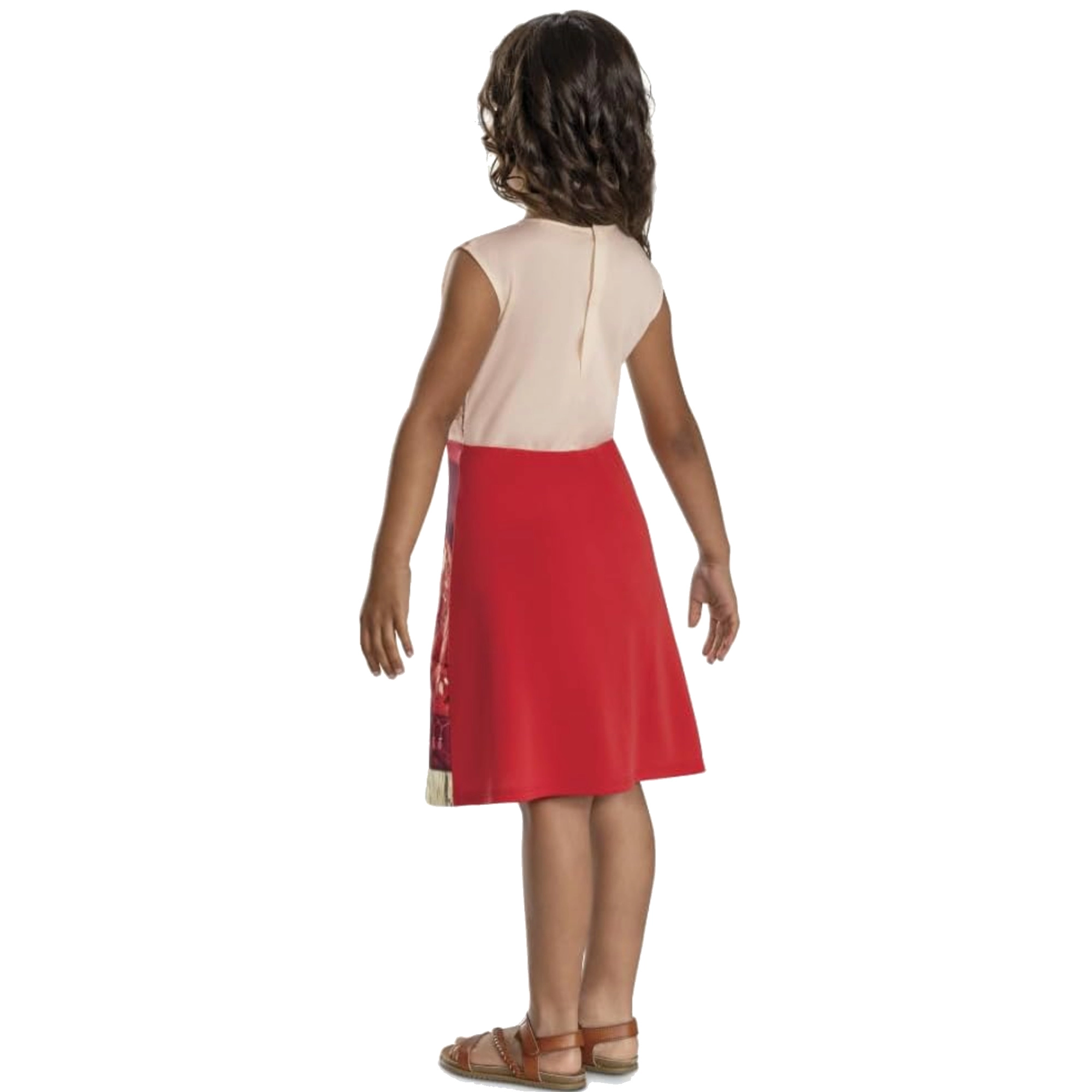 Piros–krémszínű ruha etno mintával és nyomtatott nyaklánccal – teljes Moana megjelenés további kiegészítők nélkül.