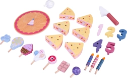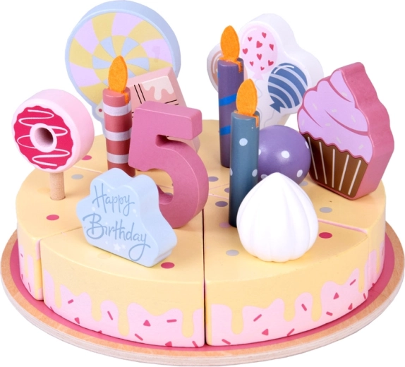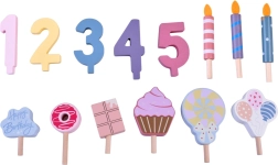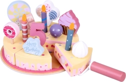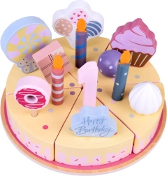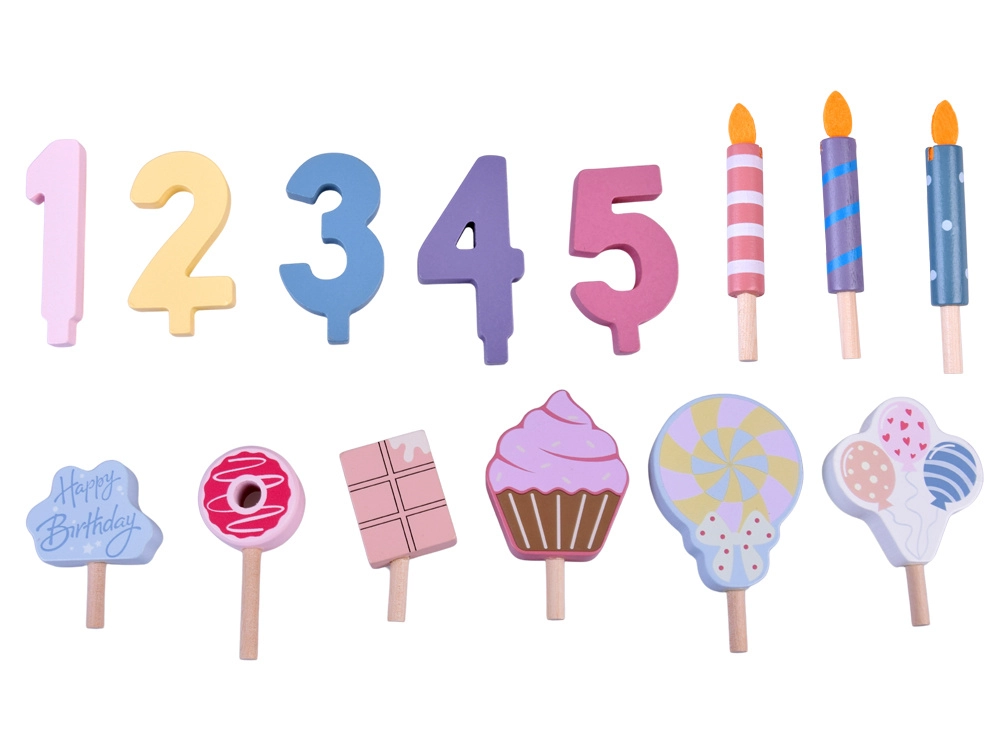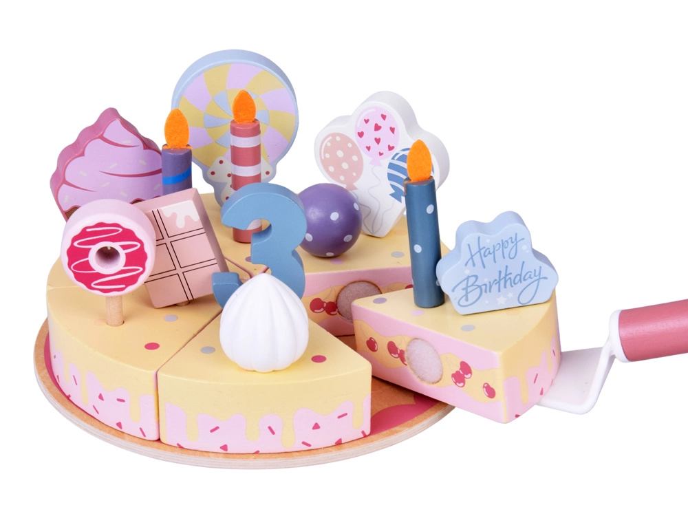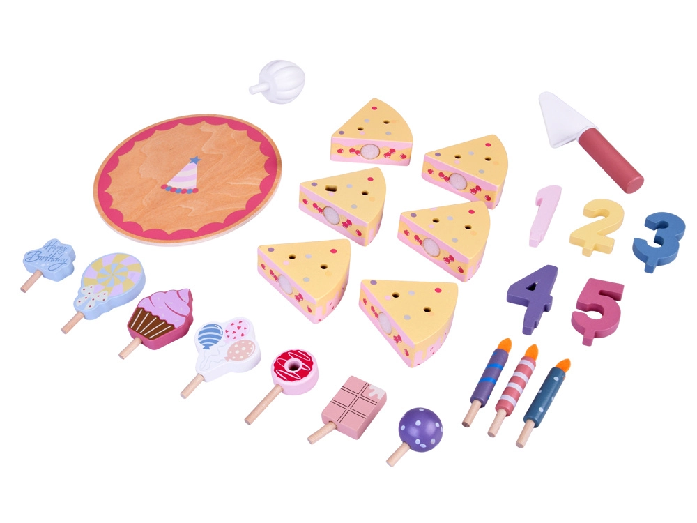 Építs saját születésnapi lakomát! A fából készült torta 6 szeletből áll, amelyek „levághatók”, majd újra összekapcsolhatók, és cserélhető gyertyákkal, számokkal és édességekkel díszíthetők. A készlet ideális közös játékhoz, színek tanulásához, számoláshoz és az udvarias felszolgálás gyakorlásához.