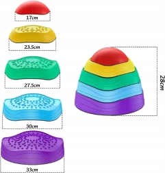A 3 éves kortól ajánlott színes egyensúlykövek fejlesztik az egyensúlyt, a koordinációt és a nagymozgást. A csúszásgátló talpnak, a különböző textúráknak és méreteknek köszönhetően ideálisak akadálypályák, játékok és kreatív mozgás kialakításához. A egymásba rakható kivitel megkönnyíti a tárolást, a vidám színek pedig motiválnak az aktív játékra.