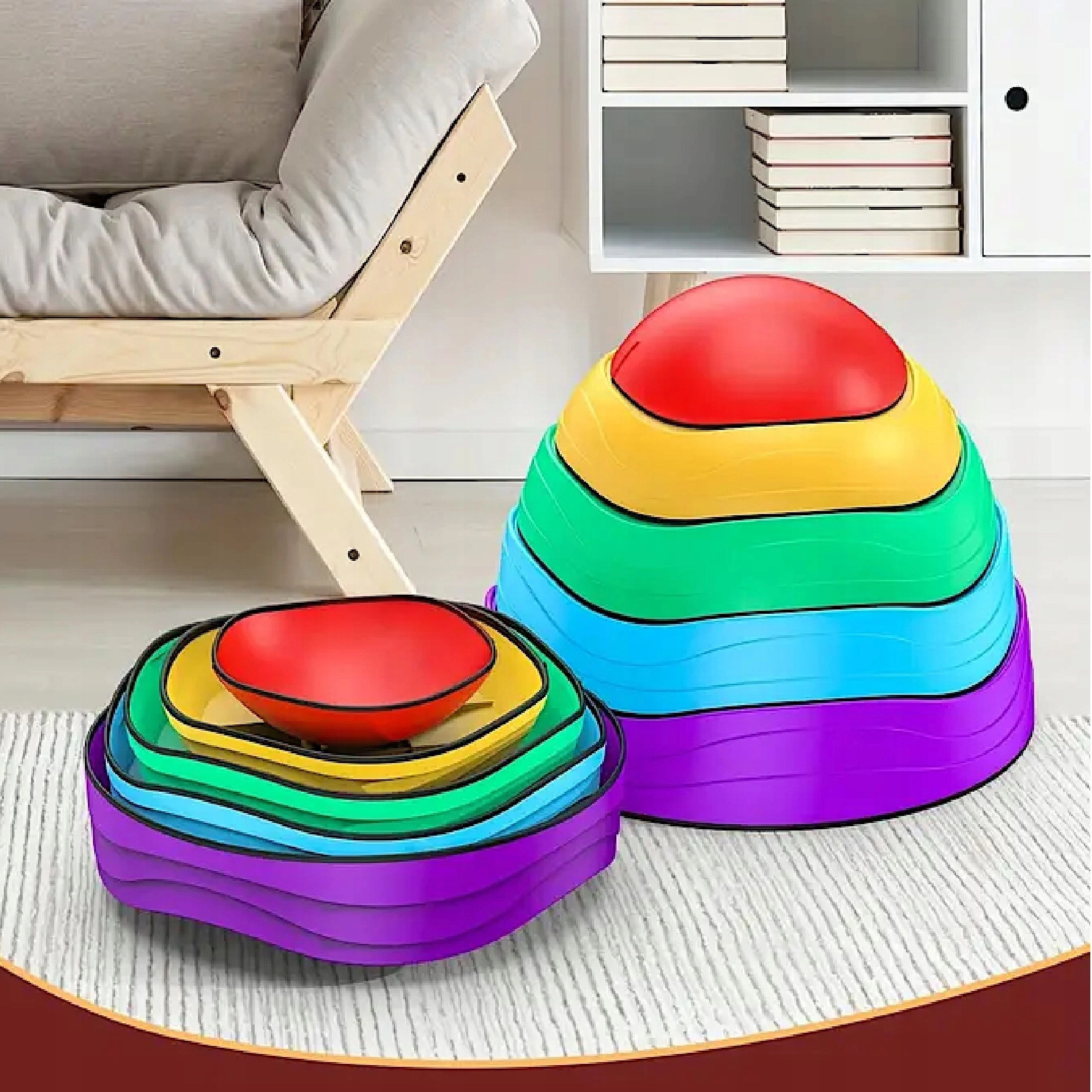 Alakíts ki otthon vagy az óvodában szórakoztató és biztonságos mozgásos zónát. Az 5 darabos szett különböző méretű és felületű szenzoros köveket kínál, amelyek támogatják az egyensúly, a stabilitás és a térérzékelés fejlődését. A gyerekek tetszés szerint elrendezhetik a köveket, ugrálhatnak közöttük, egymásra rakhatják, és akadálypályákat alkothatnak.