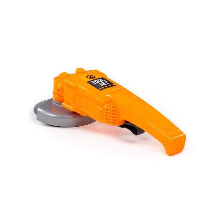 A narancssárga test, a szürke burkolat és a tárcsa hűen utánozza az igazi sarokcsiszolót, így a gyerekek igazi szakembernek érezhetik magukat.